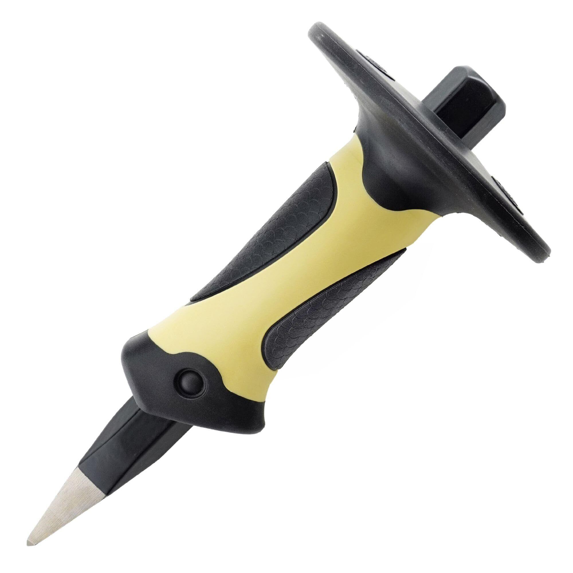 【用途】 ●モルタル、ブロック、レンガ、コンクリート等のハツリ作業に 【特徴】 ●手元をガードするツバ付きで安心してハンマーを振り下ろせます。 ●刃はクロムバナジウム材で耐久性に優れます。 ●刃は先端が尖ったチスタイプです。 【仕様】 ●サイズ/全長:約215mm、ツバ部:Φ約100mm楕円型、重さ:約580g ●材質/グリップ:PP(ポリプロピレン)、TPR(熱可塑性ゴム)、刃部:クロムバナジウム ●刃の硬度:HRC526±4