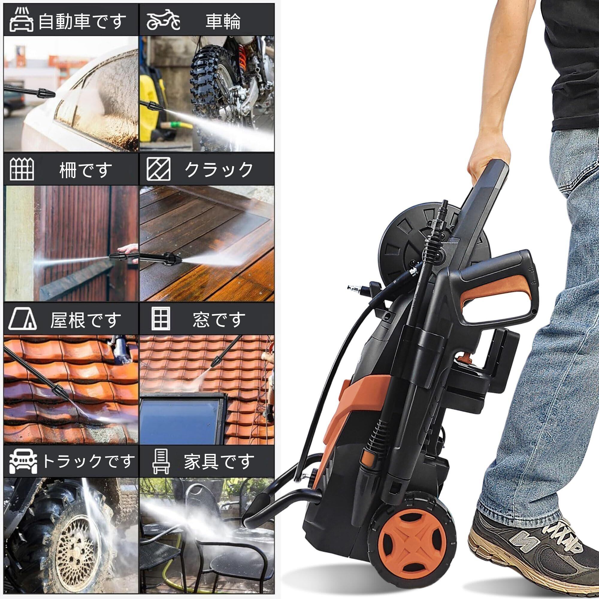 【高性能パワフル】強力なユニバーサルモーターは最大14.5MPaの水圧を420L/Hの水流で発生し、最大洗浄力を発揮します。圧ホースリール付きで収納しやすく、車輪付きで移動も簡単。モバイル高圧洗浄機、より長く安心してご使用いただけます