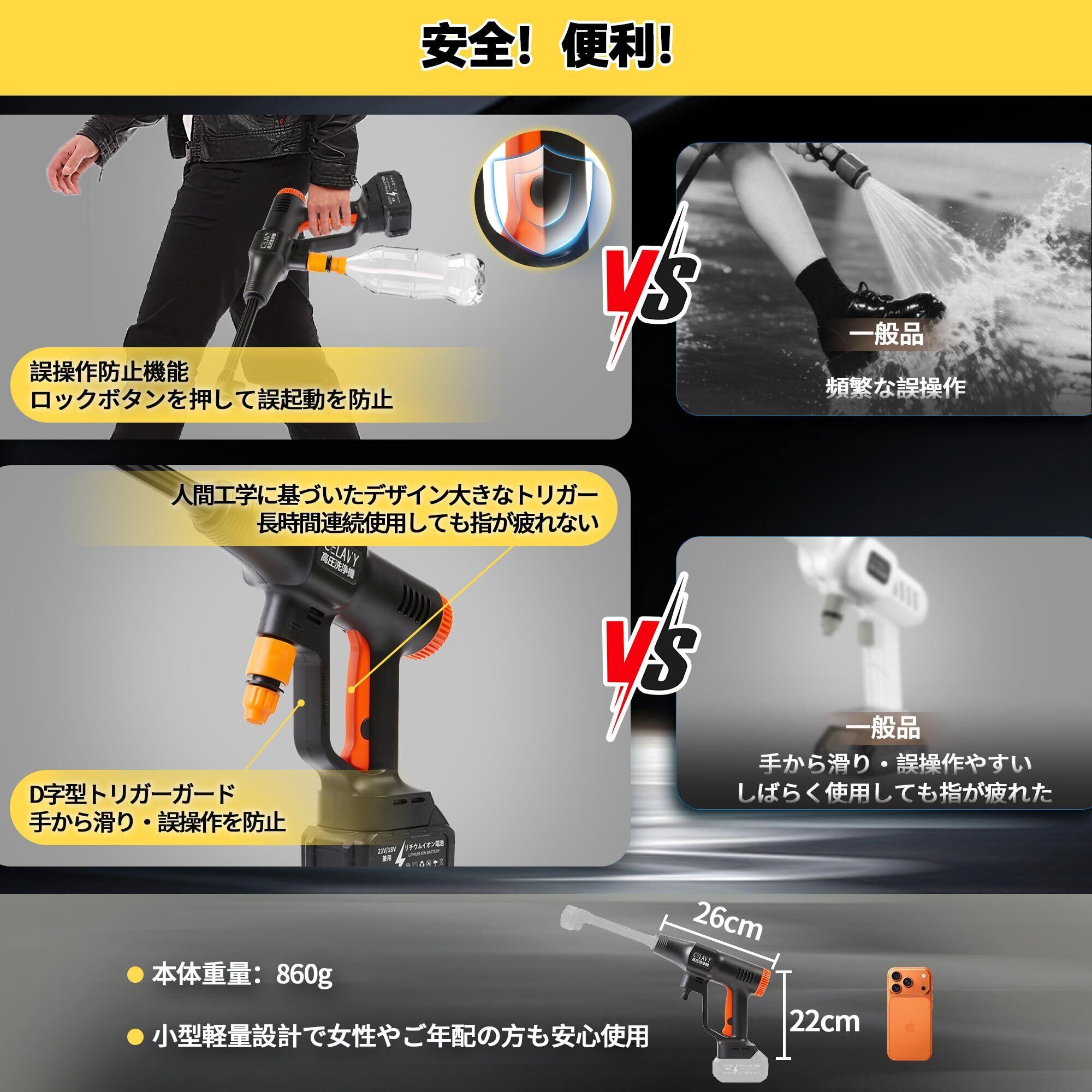 「この高圧洗浄機はコードレス設計で、どこでも気軽に使用できます。バッテリーを搭載したモバイルデザインで、家庭用洗車だけでなく、アウトドアでも大活躍します。軽量なため、持ち運びが簡単で、女性や高齢者でも楽に操縦できます。」