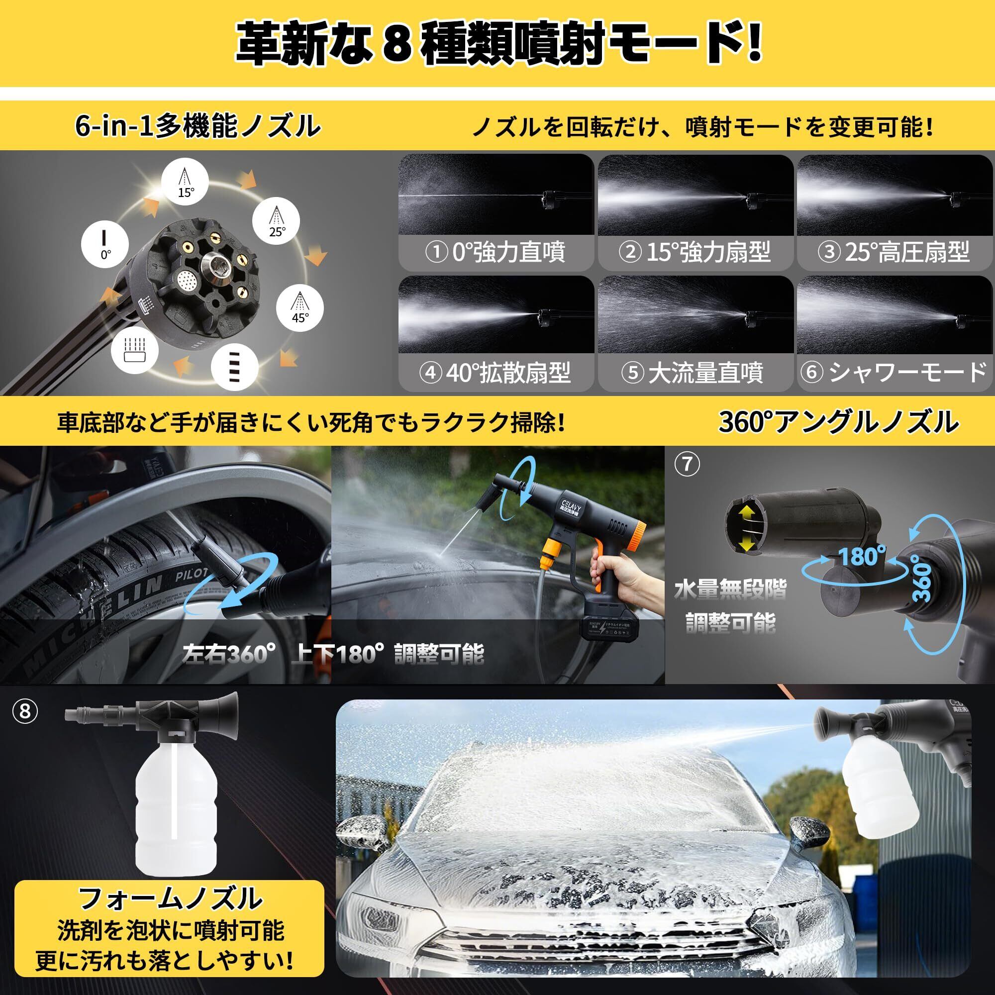 【多機能3ノズルであらゆる洗浄シーンに対応】6-in-1多機能ノズルは0°、15°、25°、40°、大流量、シャワーモードの6通りを簡単切替。プロ級の濃密泡が楽しめるフォームノズルに加え、左右360°・上下180°回転するアングルノズルを装備し、車の下回りや雨どいなど、手の届きにくい死角の洗浄もらくらくです。洗車からベランダ・浴室掃除、キャンプ用品の洗浄まで、あらゆるシーンで活躍します。
