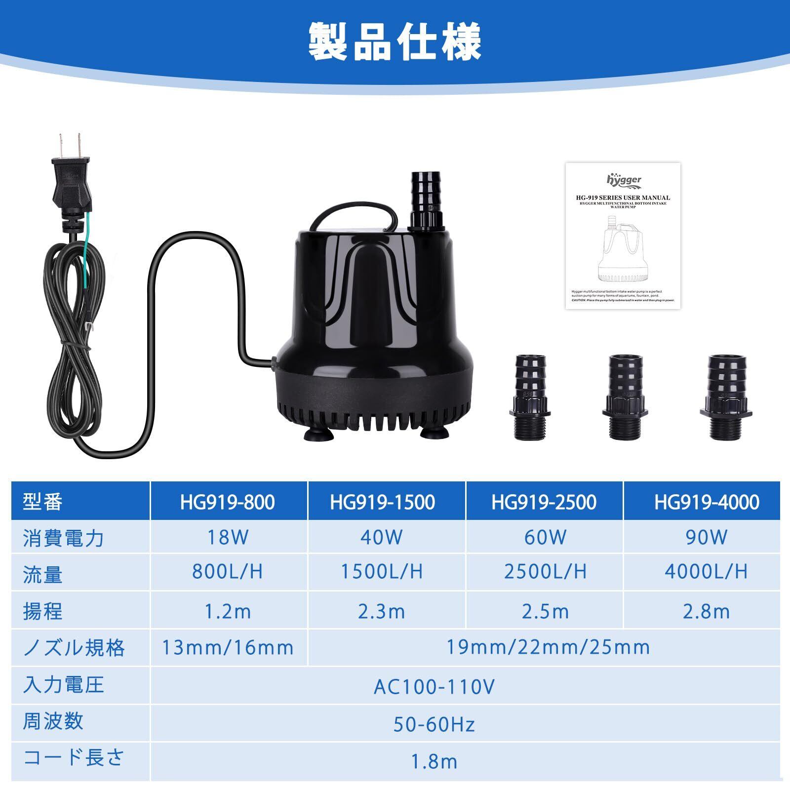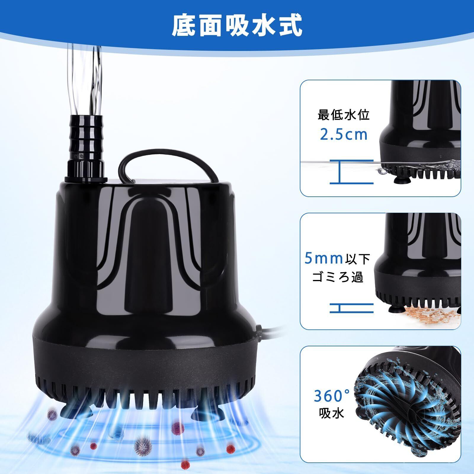 「『hygger 水中ポンプ』は、驚異の吐出量2500L/Hを実現し、最大揚程は2.5Mです。水槽や淡水、海水の給水・水換えに最適な設計で、あなたの水環境をスムーズにサポートします。」