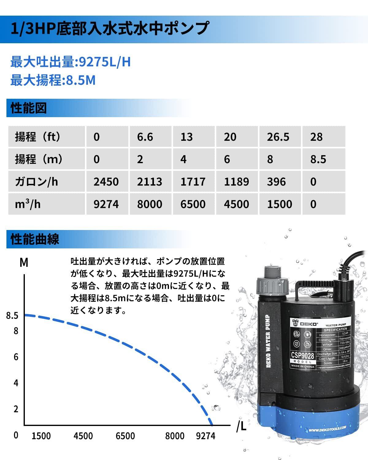 水中ポンプ DEKO 排水ポンプ 底部入水式 循環ポンプ 最大吐出量9275L/H 最大揚程8.5M 強力 ポンプ 汚水 清水両用 50/60Hz共用 電動ポンプ 水耕栽培 水槽ウォーターポンプ 水族館 給水 散水ポンプ