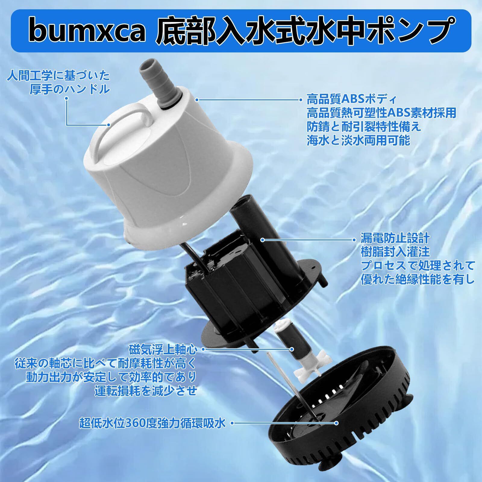 ■製品名:bumxca 底部入水式 水中ポンプ FJS0115-02 ■電源:単相・交流110/100V ■吐出量:5800L/h ■最大揚程:5.6m ■口径:25mm ■運転可能最低水位:5mm ■使用可能水深:3.5m ■定格出力:125W