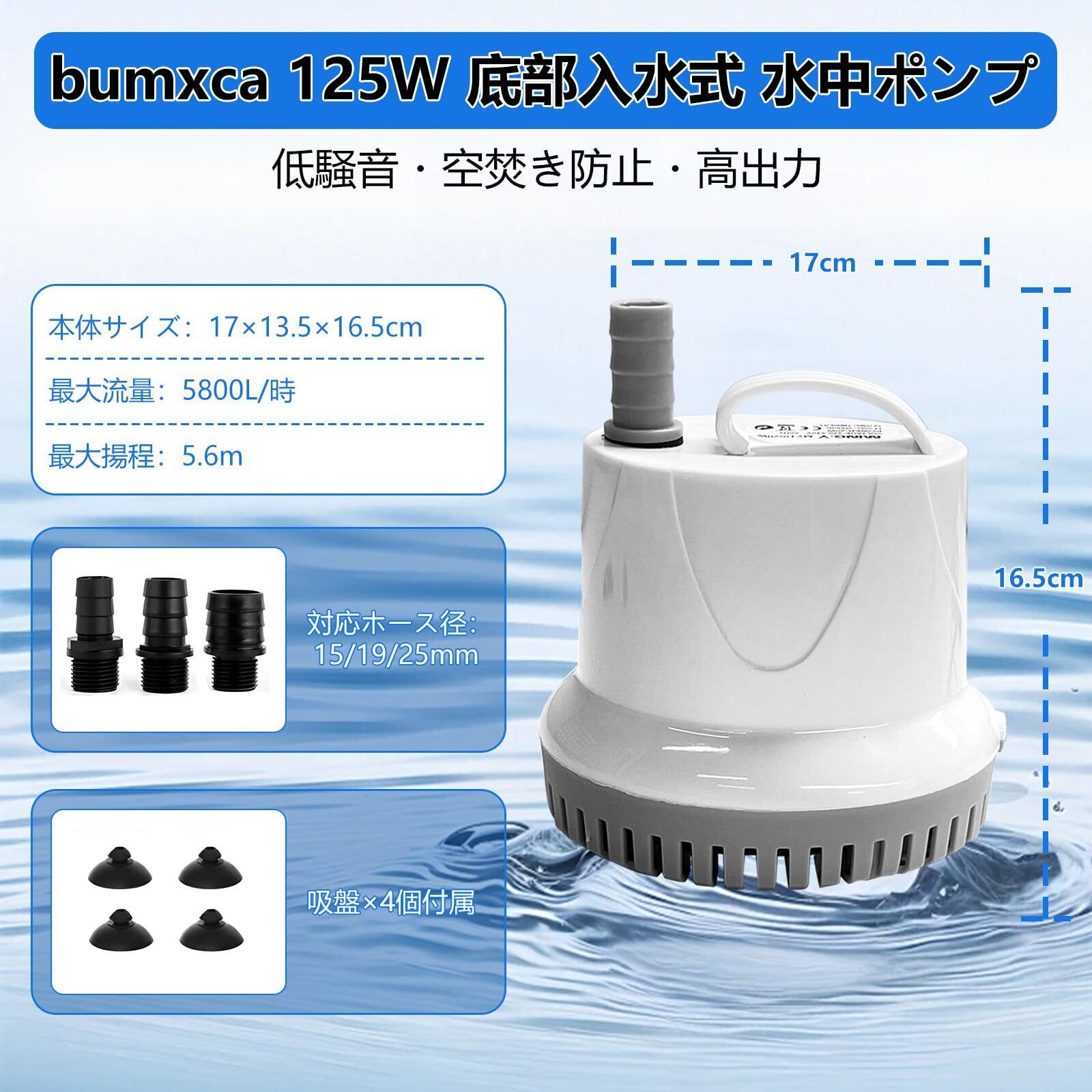 水中ポンプ 底部入水式 給水・排水ポンプ 5mm低水位対応 電動ポンプ 125w 吐出量5800L/h 揚程5.6m 50/60Hz共用 磁気浮上軸心搭載 30dB低騒音 空転防止 漏電防止 360度全方位 高圧 コンパクト 省エネ 水耕栽培/水族館/魚池/亀池/庭園/プール/いけす/お風呂 水換え 2mコード付き 15/19/25mmノズル付き 4個吸盤付き 海水と淡水両用