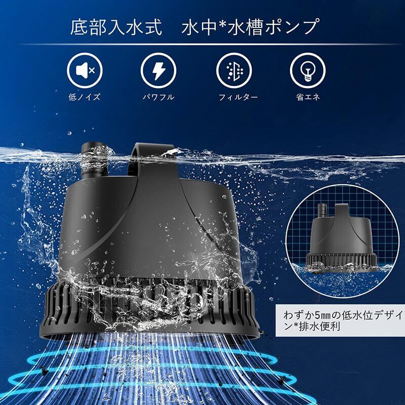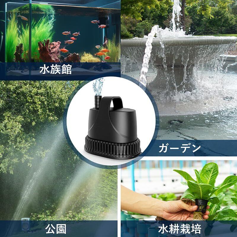 「水族館での水換え、水耕栽培の水供給、家庭プールの排水、さらには噴水や庭の池と、多様なシーンで活用できます。高い性能と多機能を兼ね備えたこのポンプは、あなたの生活をサポートします!」