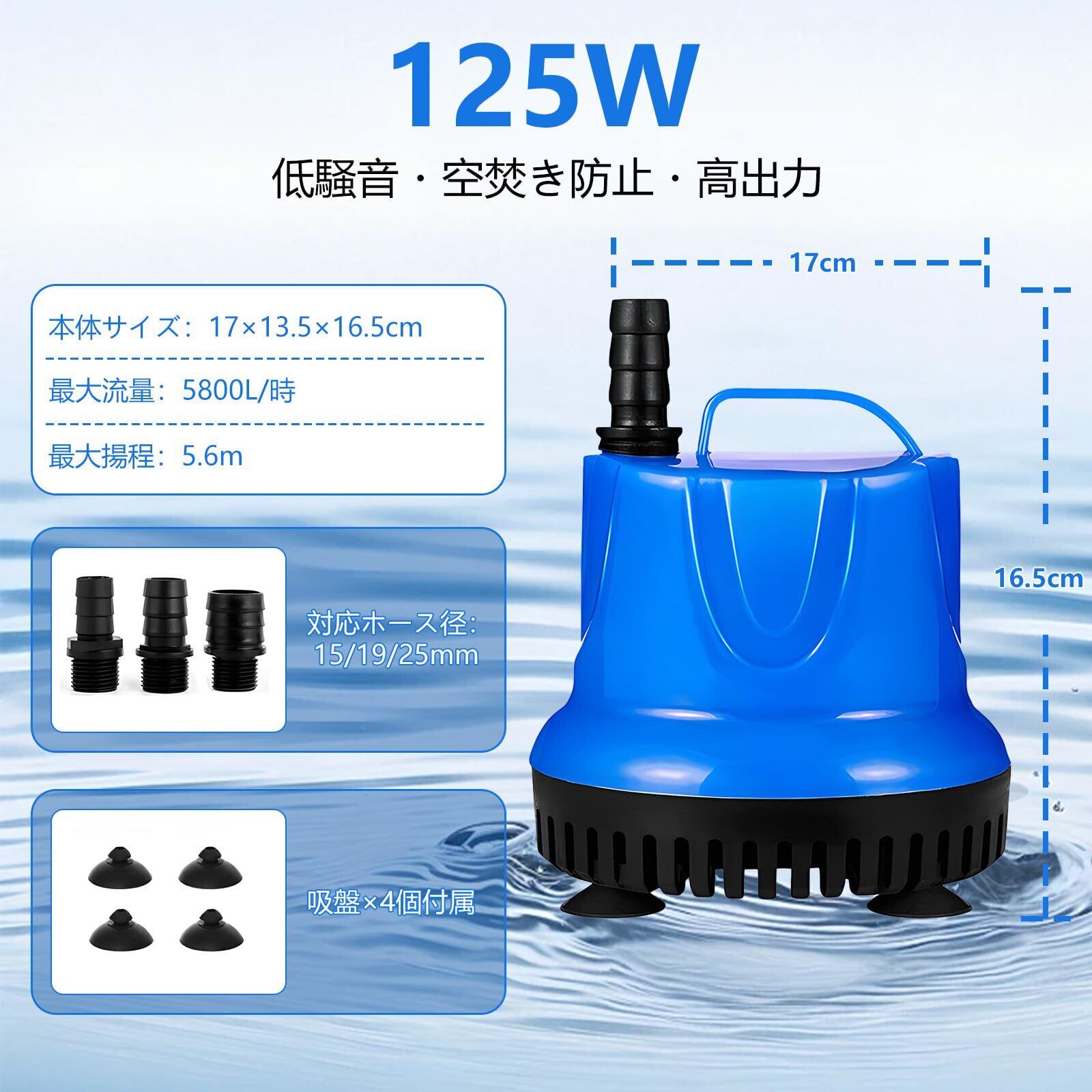 【仕様】1.周波数:50HZ・60HZ通用。2.入力電圧:AC 100-110V 。3.電力:125W。4.最大揚程:5.6m。5.ノズル外径:15mm&19mm&25mm。6.最大流量:5800L/H 。7.電源コードの長さ:1.7M。8.吸盤4個付き 。騒音クラス:30デシベル以下。ご注意:電源を入れて水が出ない場合、ポンプの中に空気があって排出できない可能性があり、ポンプを水面に出してまた水に入れて空気が排出できます。空気を排出すれば正常に使用できます。