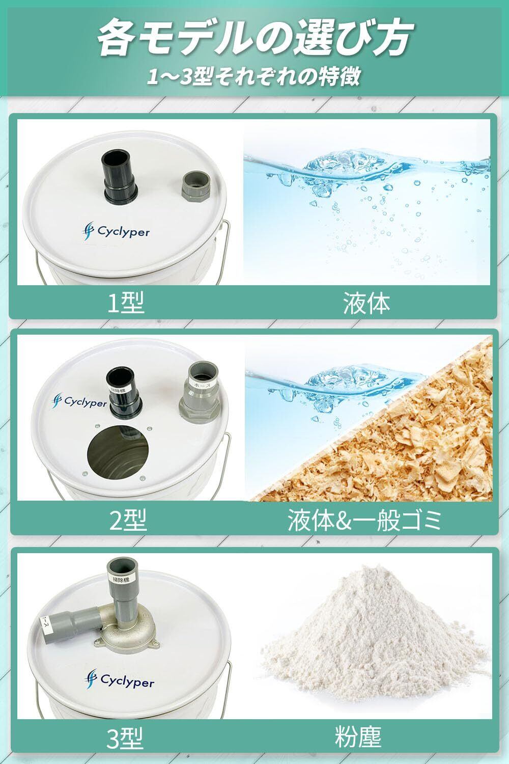「『Cyclyper サイクリーパー 1型』は、業務用として求められる強力な集じん力を備えています。液体対応のサイクロン集塵機という画期的なデザインにより、特に木工やDIY作業において、粉塵をしっかりと吸引し、クリーンな作業環境を確保します!」