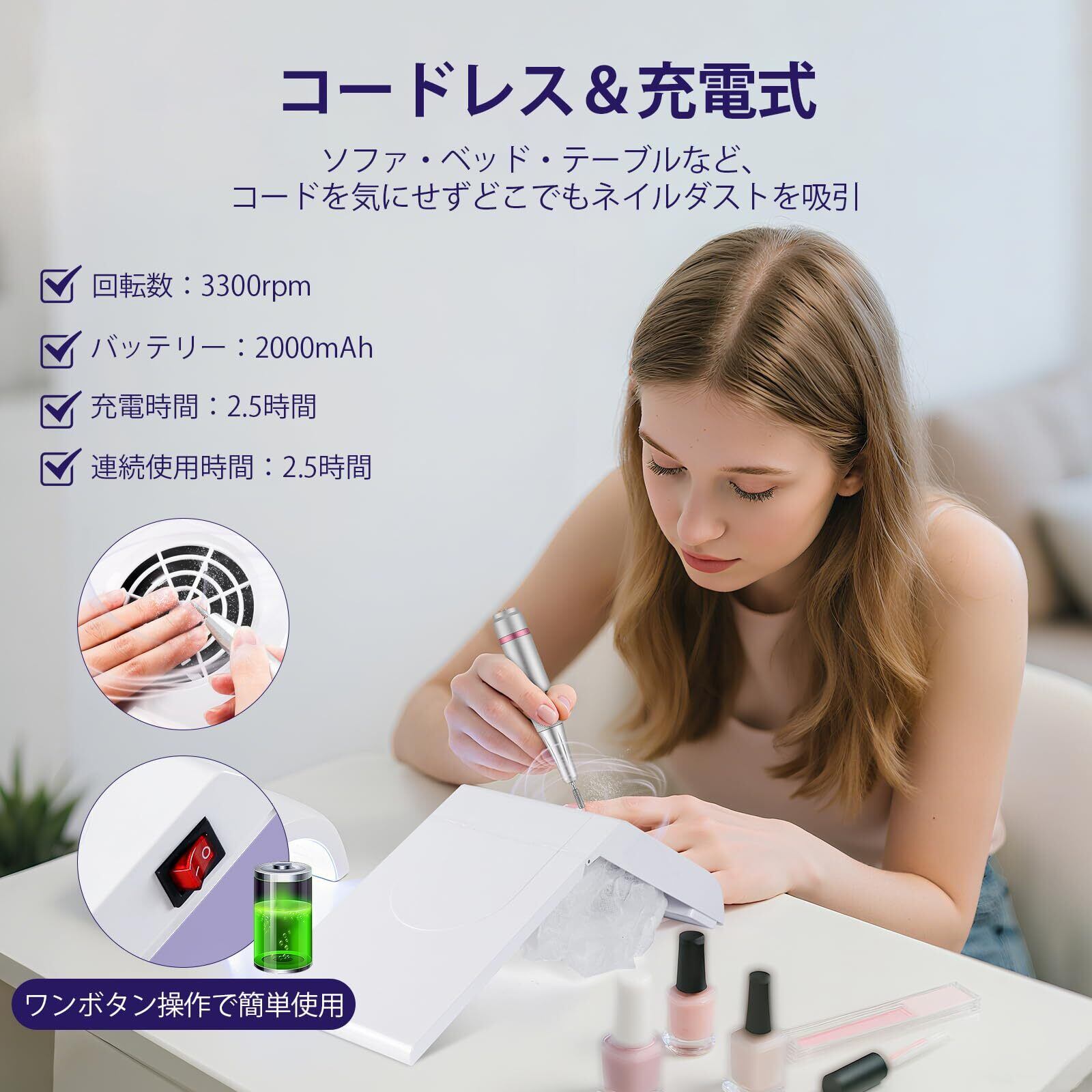 【3300RPM超強力吸引】ネイルダストを瞬時にキャッチ! 3300rpmの超強吸力でネイルダストを一掃:当ネイルダスト吸塵機は、最大3300rpmの強力な吸引力を備えています。ネイルアート作業中に発生する微細なダストや粉屑を瞬時に吸い込みます。爪を磨いたり、ポリッシュを削ったときに飛散するパウダーが、周りに散らばることを心配する必要がありません。この強力な吸引力により、作業環境を常にきれいに保ち、ネイルワークを快適に行えます。