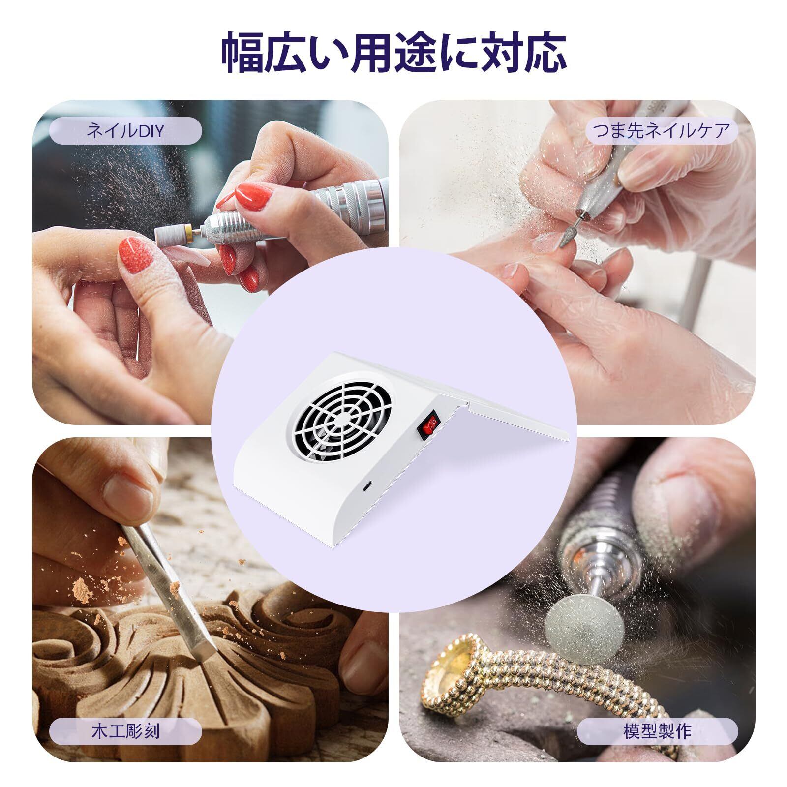「ネイル作業だけでなく、模型製作や手芸などの細かい作業にも活用できます。集じん機としての性能だけでなく、さまざまな作業シーンでの活躍が期待される多機能アイテムです。」