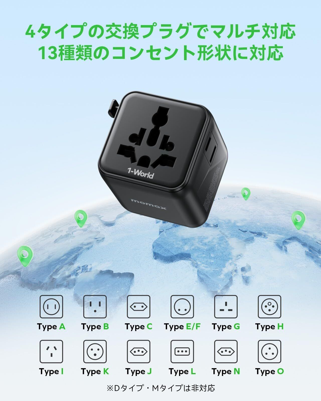 「『MOMAX 変換プラグ』は、C/BF/O/Aタイプに対応しており、ヨーロッパ、韓国、イギリス、アメリカ、オーストラリアなど、様々な国の電源コンセントに対応します。これ一つで世界中の電源に接続できるので、海外旅行や出張の際に非常に便利です!」