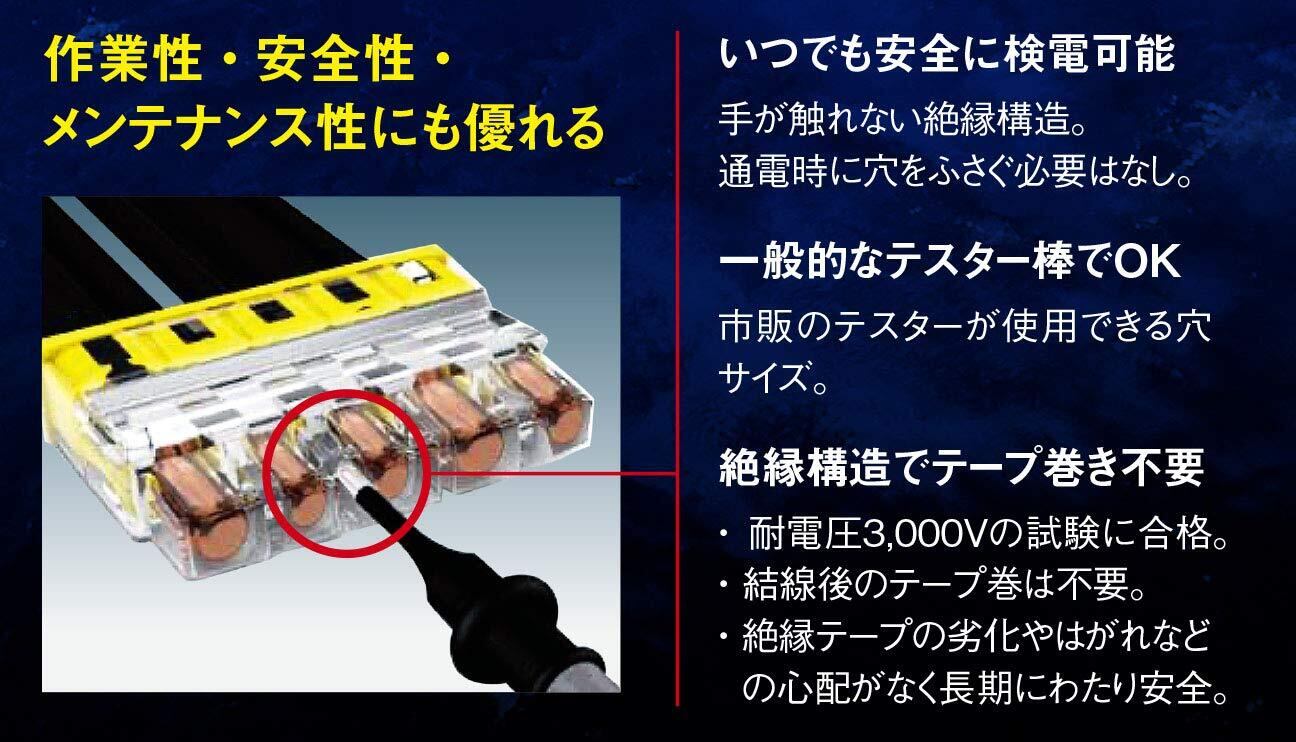 「このコネクタは、簡単に差し込むだけで確実な接続ができるため、時間と労力を大幅に削減できます。初心者からプロの方まで、誰でも安心してご使用いただける親切な設計です。忙しい日常の中でも手軽に配線作業を進めることができます。」