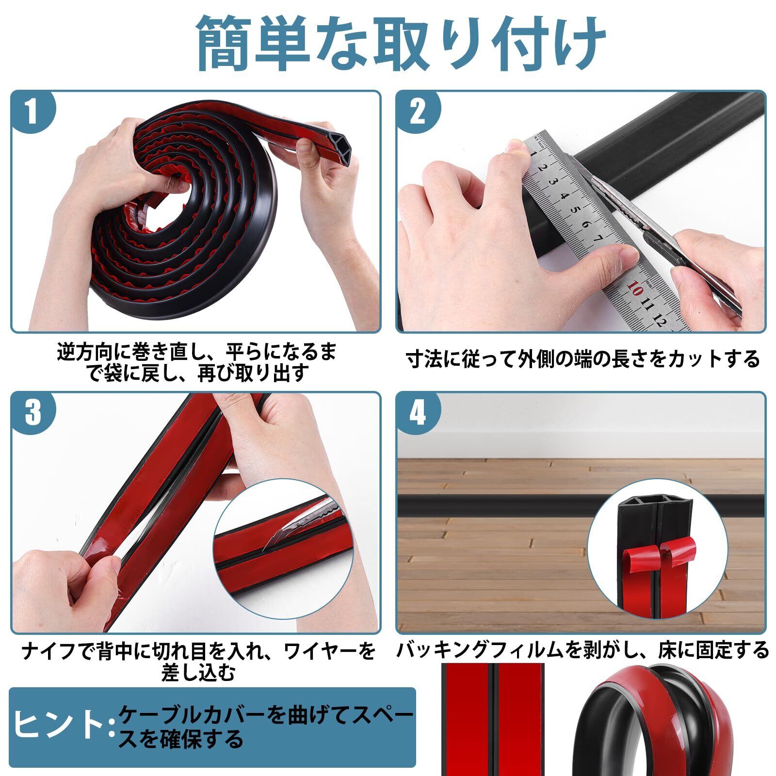 「このフロアコードカバーは、あなたの日常生活をまた一歩快適にすること間違いなしです。配線が見えないことで、お部屋がスッキリし、ストレスフリーな空間を作り出します。この機会にぜひ、お試しください!」