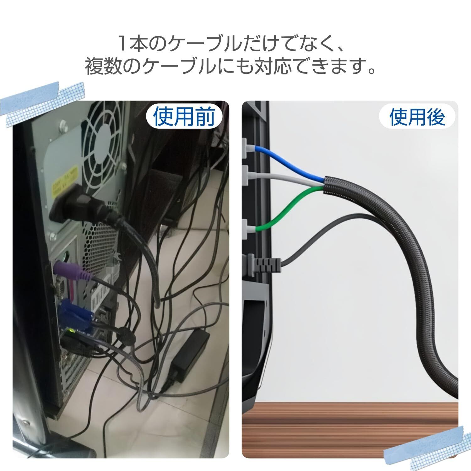 「内径約13mmで多様なケーブルに対応し、必要な部分だけをカットしてお使いいただけます。さらに内径の拡張も可能なため、環境に合わせた柔軟な使用が可能です。オフィスや家庭での配線整理が簡単に行えます!」