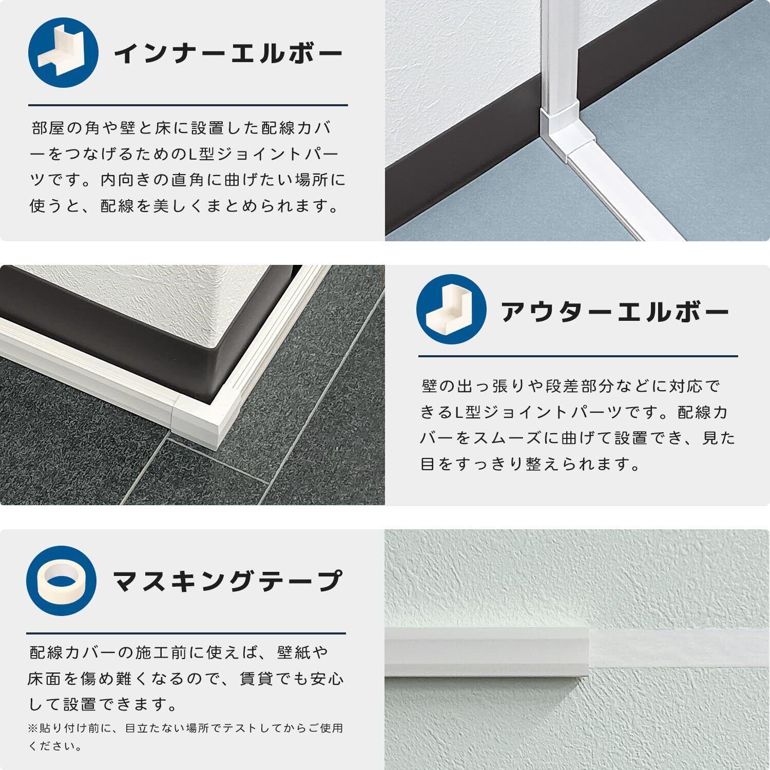 【ポイント4:設置場所によってカスタマイズが可能!】配線カバーは、お好みの長さに合わせてカットができるので、設置場所を選びません、インナーエルボーやアウターエルボーなど、コネクタパーツを多数付属しており、複雑な配線にも対応、付属のパーツを使えば、壁にフィットし無駄なく綺麗に仕上がります。