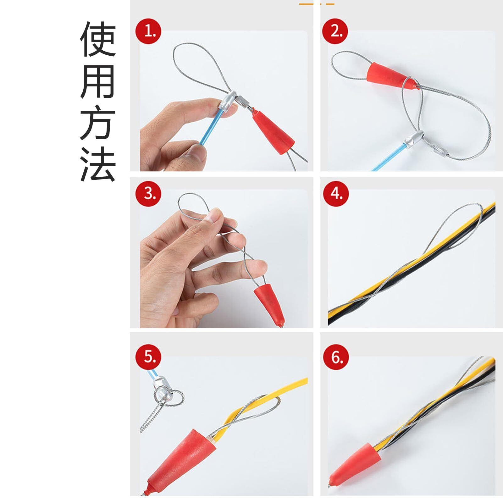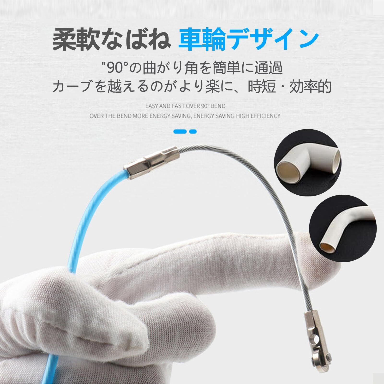 「この通線ワイヤーは、電線通しや配線通し、さらにはCD管やPF管の使用に最適です。柔軟性があり、また適度な硬さも持っているため、狭いスペースでもスムーズに操作できます。特に、曲がった部分でも扱いやすい設計が施されています。」