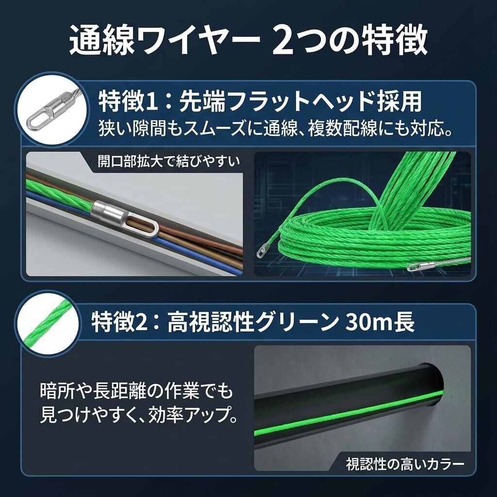 【防水性・耐久性に優れた通線ワイヤー】 本製品は、ロッド径4.5mm・長さ30mの強靭な入線専用ワイヤーです。防水性・耐久性に優れ、押しや湾曲などの衝撃にも強く、折損や破断しにくい設計。グリーン色で視認性にも配慮しています。 【優れた通線性能・スリムヘッド設計】 柔軟性と適度な硬度を兼ね備えたスチールワイヤーで、CD管・PF管・曲がりの多い配線経路でもスムーズに挿入が可能。スリムヘッド仕様により、あらゆるコーナーや曲がり角で威力を発揮し、長距離の通線作業にも最適です。 【プロもDIYも満足の使用感】 通線の専門家はもちろん、DIYでの電線通し、ケーブルキャッチャー、リードワイヤーとしても大活躍。ご家庭の配線作業や設備工事など、幅広い場面で使える通線工具です。 【安心の多用途対応】 CD菅・PF管をはじめ、通線電線通し、ロープ通し、結束ワイヤー、よりもどしジョイントワイヤーとしても活用可能。柔軟かつ強靭な性能で、作業効率を大幅に向上させます。