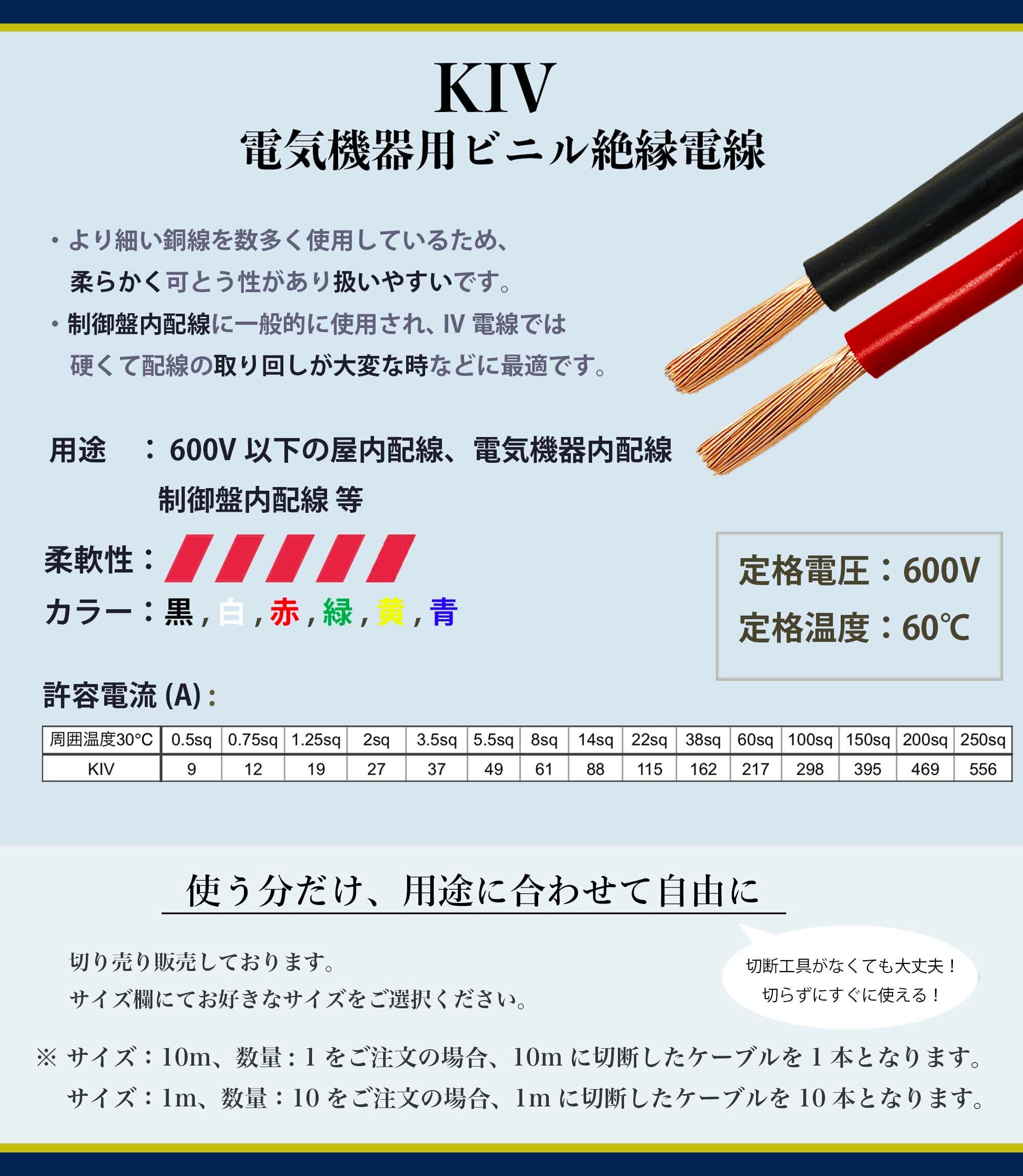 「このKIVケーブルは、配電盤の配線や各種電気機器の接続、さらには広い用途にわたる使い方が可能です。また、一般家庭から業務用まで、様々な場面で活躍します。」