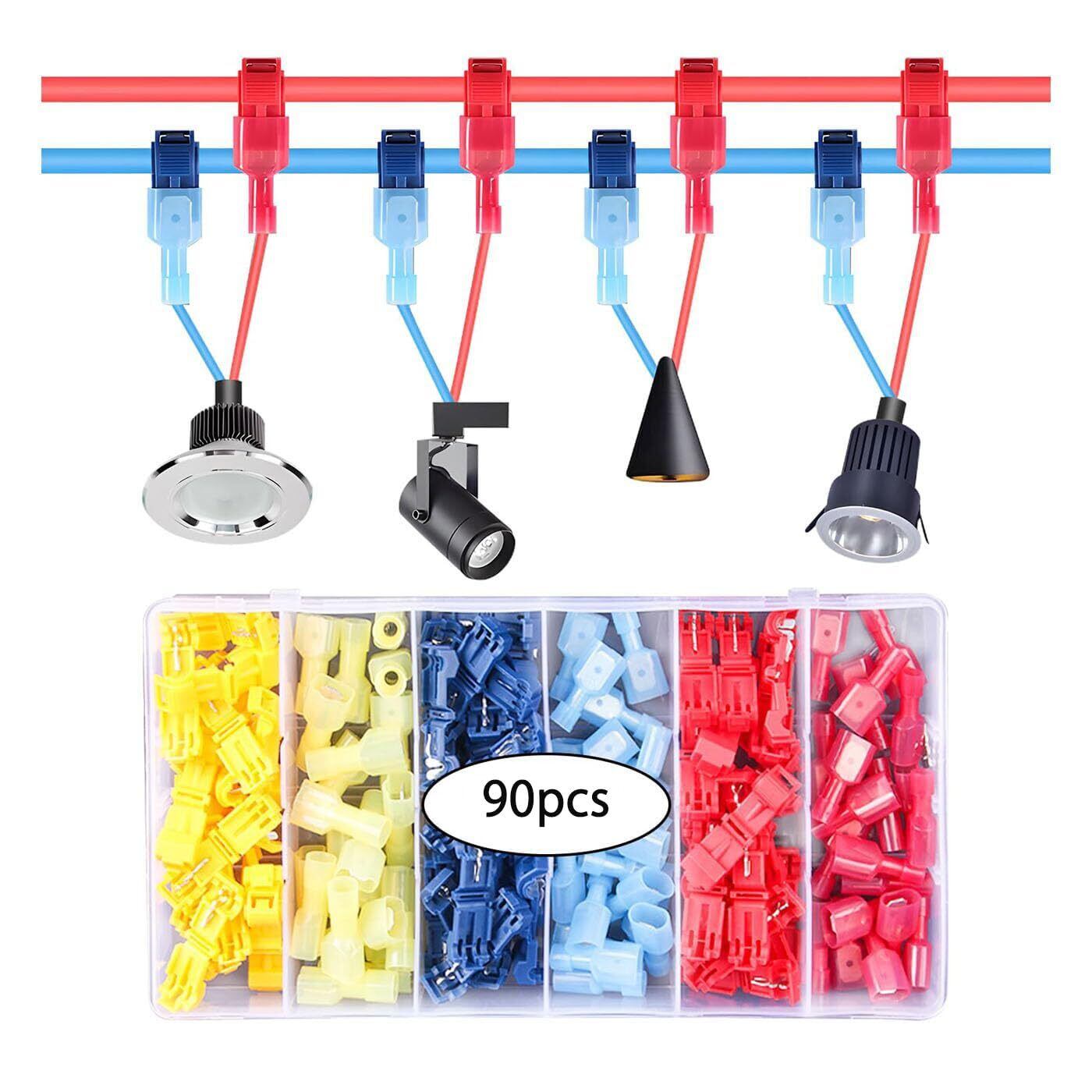T型配線コネクター 配線分岐コネクター 平型端子 簡単に速く配線取り付け 電線クイックスプライス端子 分岐/配線/接続/細線用 (赤/黄/青 90個セット)