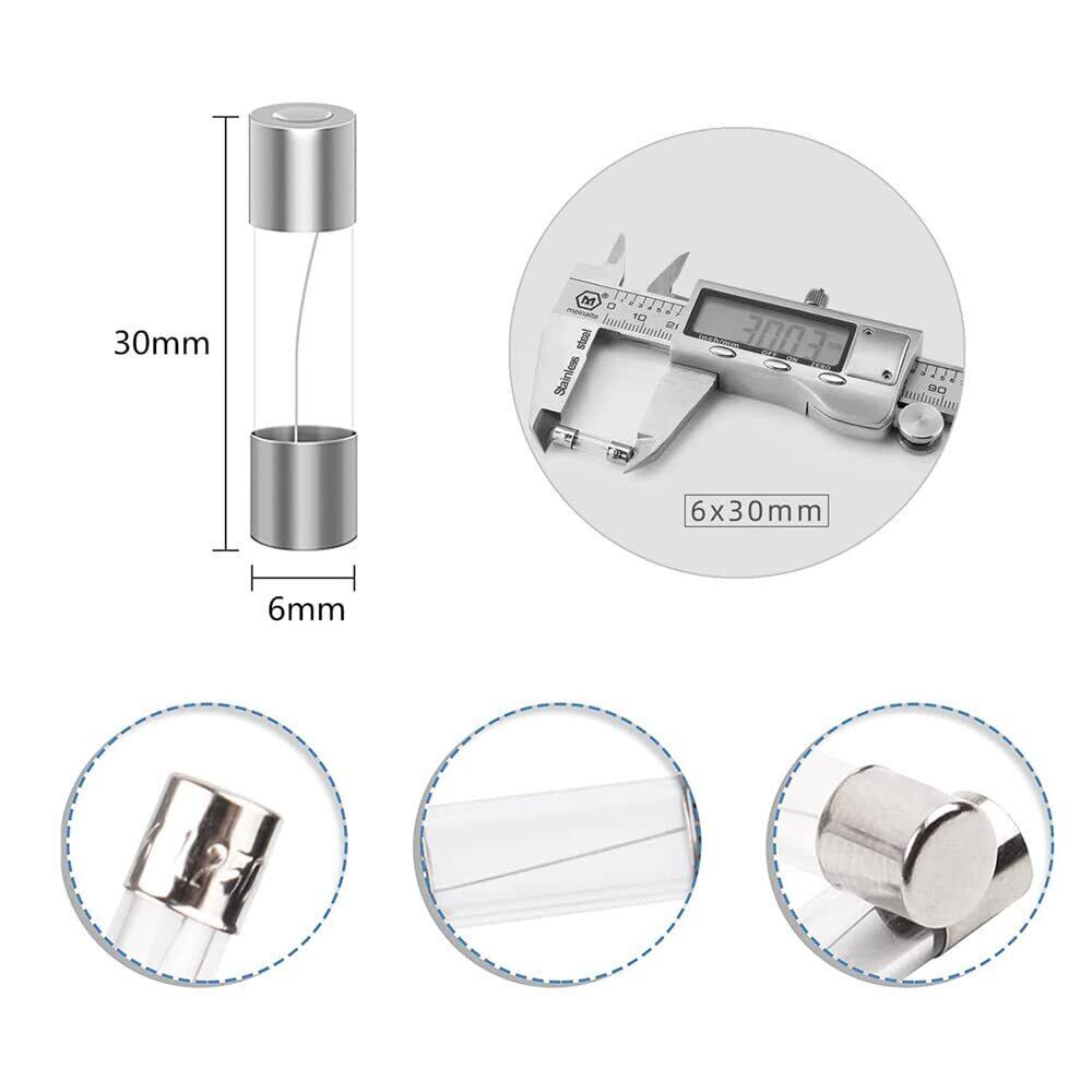 「φ6mm x 30mmのコンパクトなサイズは、家庭用電化製品やさまざまな電子機器で活躍します。丈夫なガラスとニッケルメッキ材の銅キャップにより、優れた導電性と信頼性を提供。長期間の使用が可能です!」