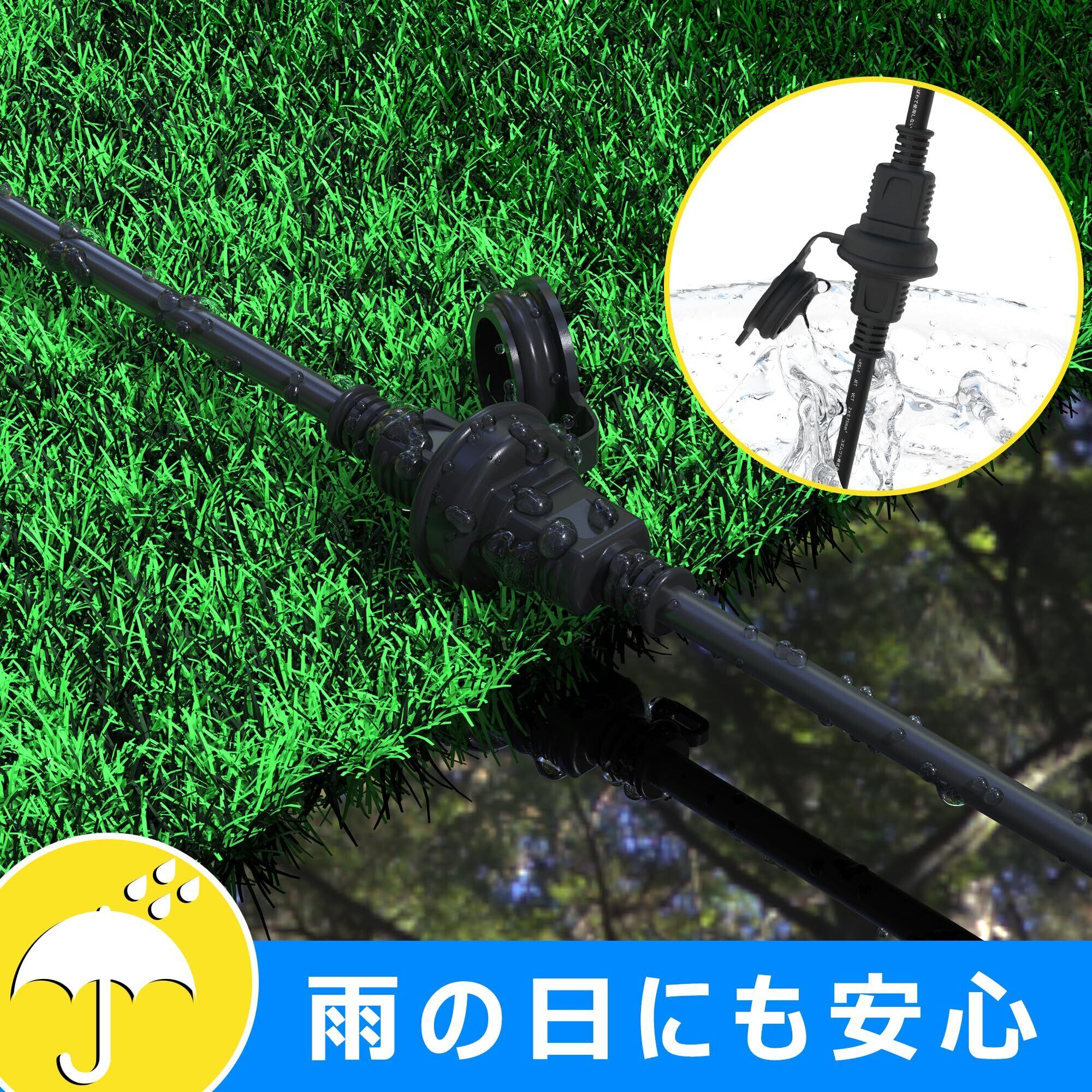 「この『延長コード 防雨延長補助コード』は、悪天候にも強い防雨型設計です。急な雨や湿気に対応し、安心して電源を確保できます。(ただし、完全防水ではないため、大量の水がかかる場所や水中での使用は避けてください。)」