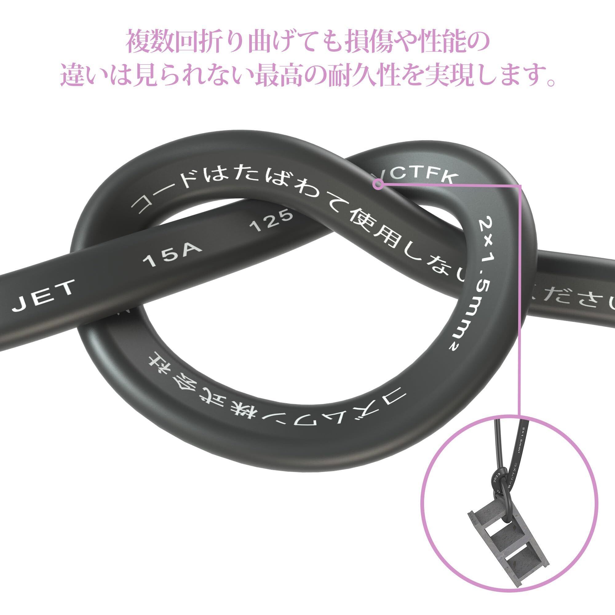 「この延長コードは耐トラッキング性能を備え、二重被覆設計によって耐久性も向上しています。1500Wまでの電源に対応しており、日常の電気機器を安心して使用できます。」