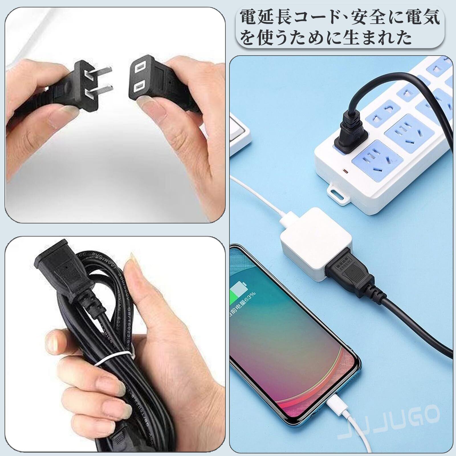 「この『電源延長コード』は、耐熱PVC材質を使用し、高い耐熱性と難燃性を備えています。安全に長時間ご利用いただけるため、屋内外問わず多様なシーンで安心してお使いいただけます。」