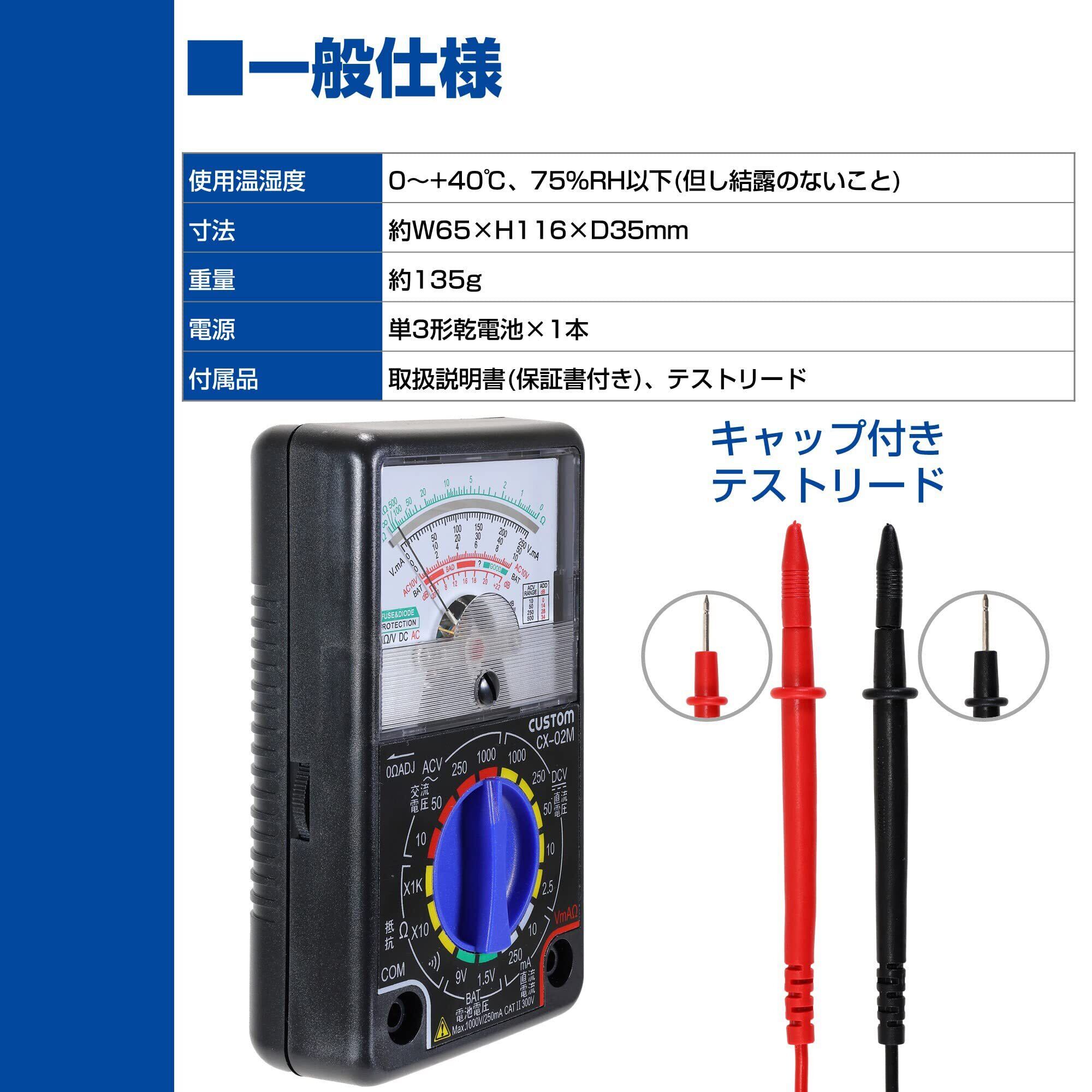 ■測定方法 ■直流電圧:2.5V/10V/50V/250V/1000V ■交流電圧:10V/50V/250V/1000V ■直流電流:10mA/250mA ■抵抗:×10(10kΩ)/×1K(1MΩ) ■導通試験:約80Ω以下でブザー ■電池チェック:1.5V/9V ■低周波出力:-20~50dB ■付属品:テストリード 1組、単三形乾電池 1本 (テスト用 内蔵)、取扱説明書、ヒューズ内蔵(0.5A/250V(Φ5×20mm))