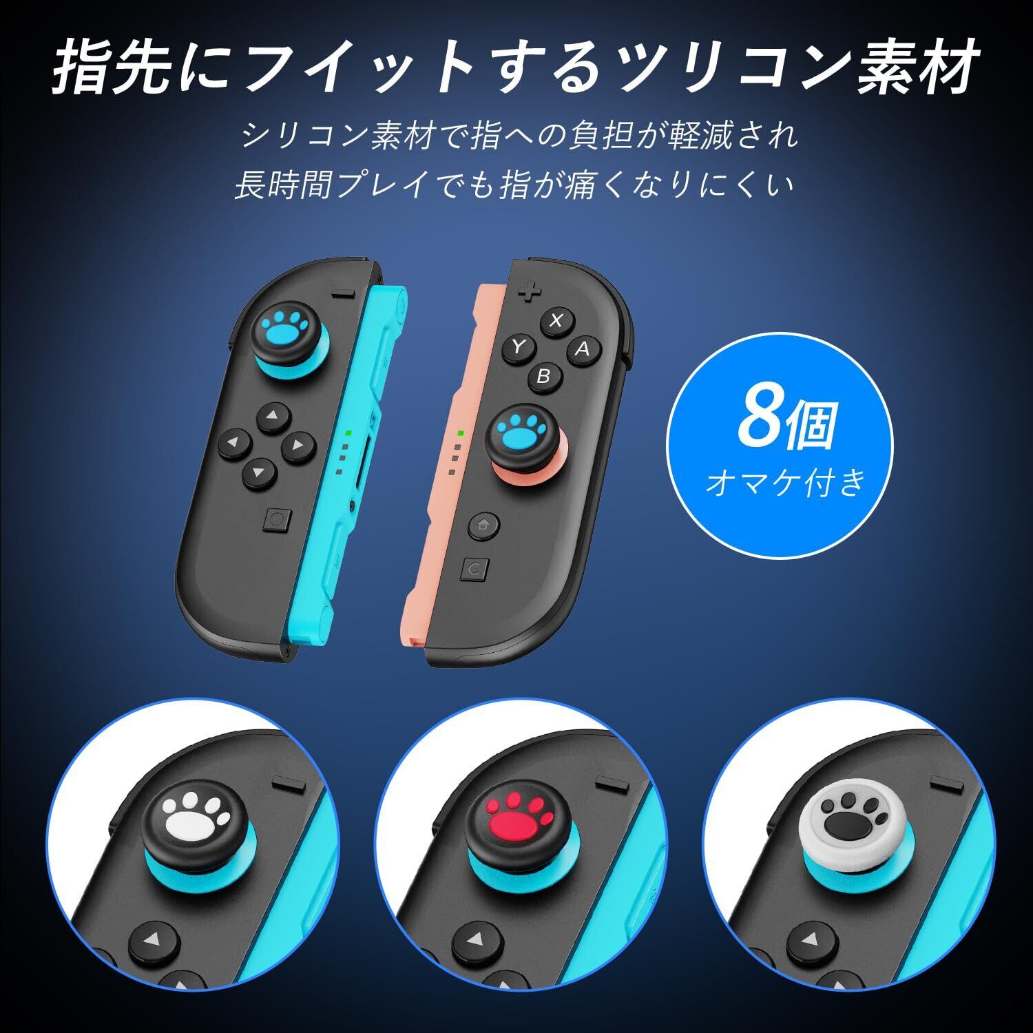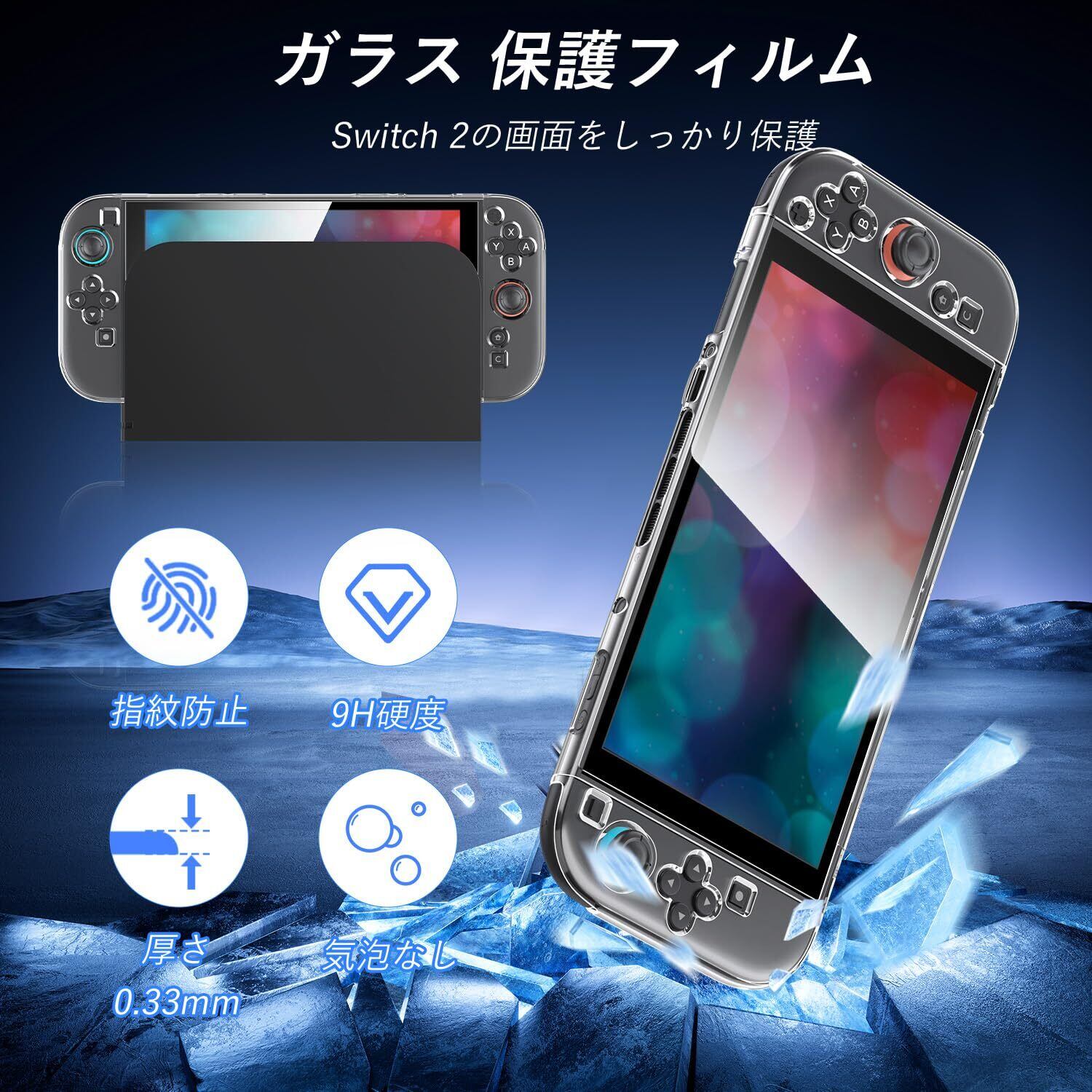 「ガラス保護フィルムとスティックキャップ8枚がセットになっており、これだけで即能行動!フィルムは高い透明感を保ちながら、傷や汚れから画面を守ります。スティックキャップは操作性をアップさせるため、より快適にゲームを楽しめます。」