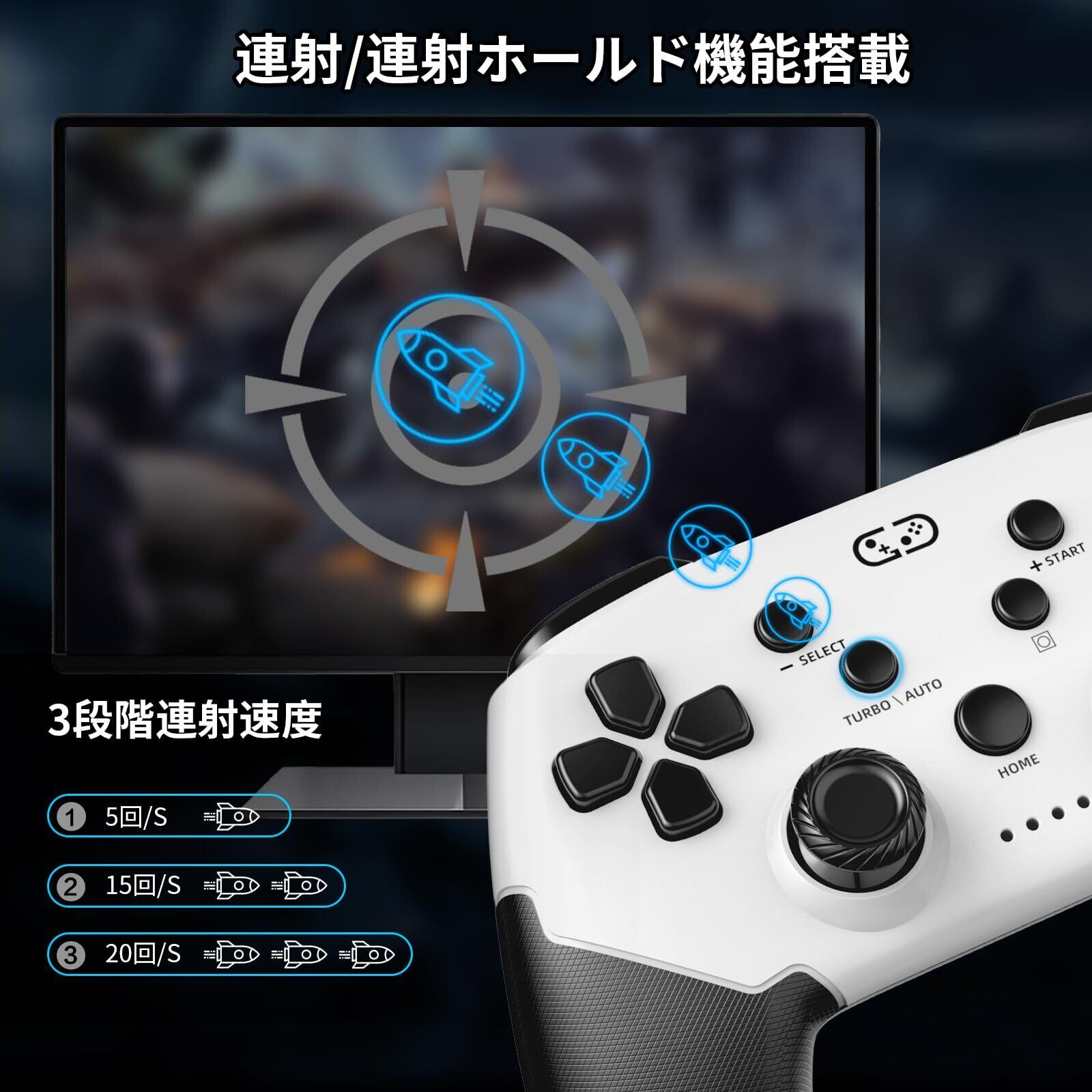 【6軸ジャイロセンサー搭載&自動連射(連射ホールド)機能】純正プロコンと同等の高感度6軸ジャイロセンサーを搭載し、コントローラーの傾きや動きを検知できます。(一部のゲームでジャイロセンサーが反応しない場合は、ゲーム内でまたは本体設定で補正することを試してください。)スクリーンショット機能付き、ワンタッチでゲームの画像を簡単に保存しております。また、本コントローラーは自動連射機能付き、TURBOボタンと設定したいボタン(A/B/X/Y/L1/L2/R1/R2ボタン)を同時に押して、手動連射になって、再度押すと、自動連射(連射ホールド)になって、三度目押すと、連射が解除されます。Turbo連射速度は3段階(毎秒5/15/20回)の微調整ができ、ゲームや自分のプレイスタイルに合わせて設置できます。※コントローラーがペアリングできない、ボタン反応しないなど、動作に異常がある場合は、背面にある小さな穴(ボタン)を針または細い棒状のもので押してから、製品を再起動してリセットします。