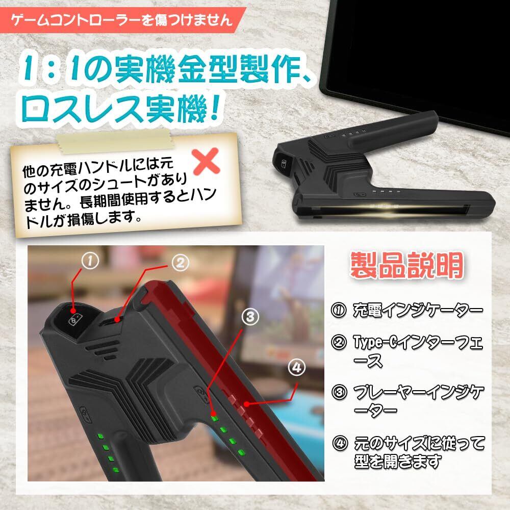 【ゲーム中に充電可能】ゲームを中断せずにJoy-Conコントローラーを充電できるため、電池切れの心配なく長時間ゲームを楽しむことができます。コントローラーを充電ハンドルに取り付け、USBポートに接続して充電します。