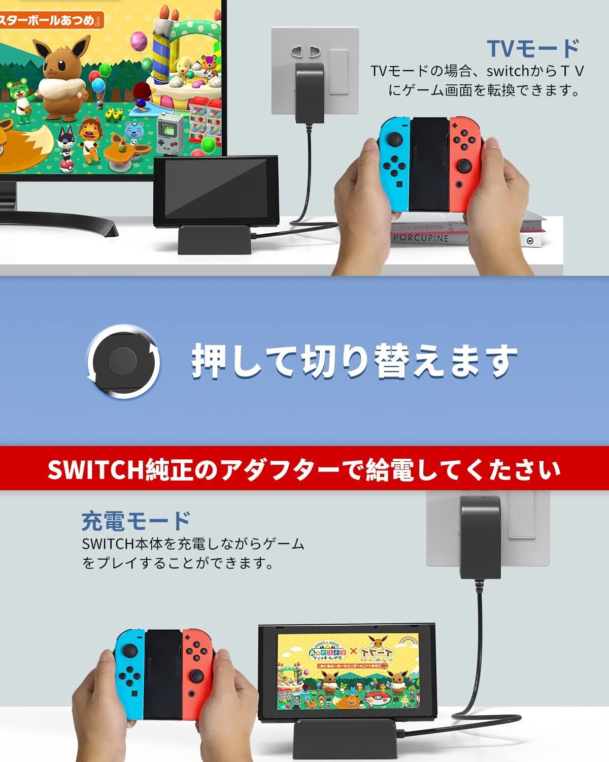 【TVモード/テーブルモード】ドックの上にあるボタンで、Switch本体の映像モードとTV出力モードに切り替える機能が実現しました。switch ドックは複数のUSBポートがあって、多種のデバイスに対応できます。テーブルモードの場合、充電しながらゲームができます。TVモードに切り替えて、大画面ゲームを体験することもできます、大画面でみんなでゲームを体験できます。(switch純正の電源が推奨されていますので、純正充電器を接続し)。