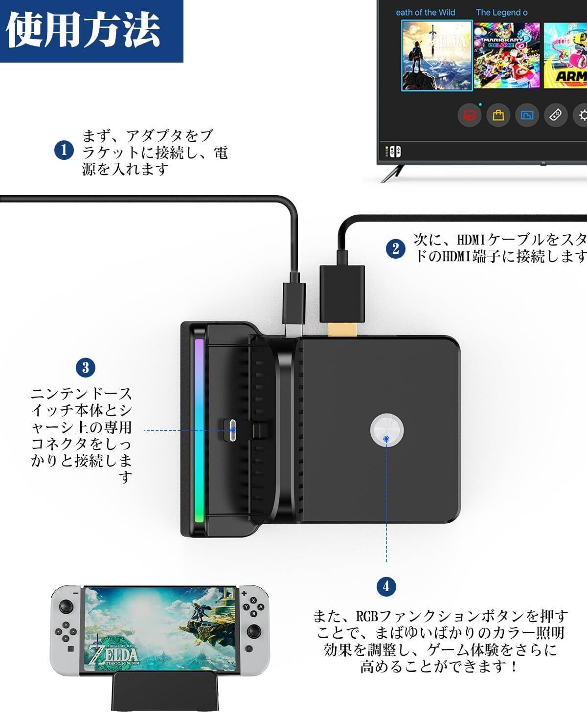「このドックは可携式スタンドとしても使えるため、外出先でも快適にゲームを楽しむことができます。いつでもどこでもスイッチをセットアップして、仲間とのゲームを楽しみましょう。自宅でも外出先でも、あなたのスタイルに活躍します!」