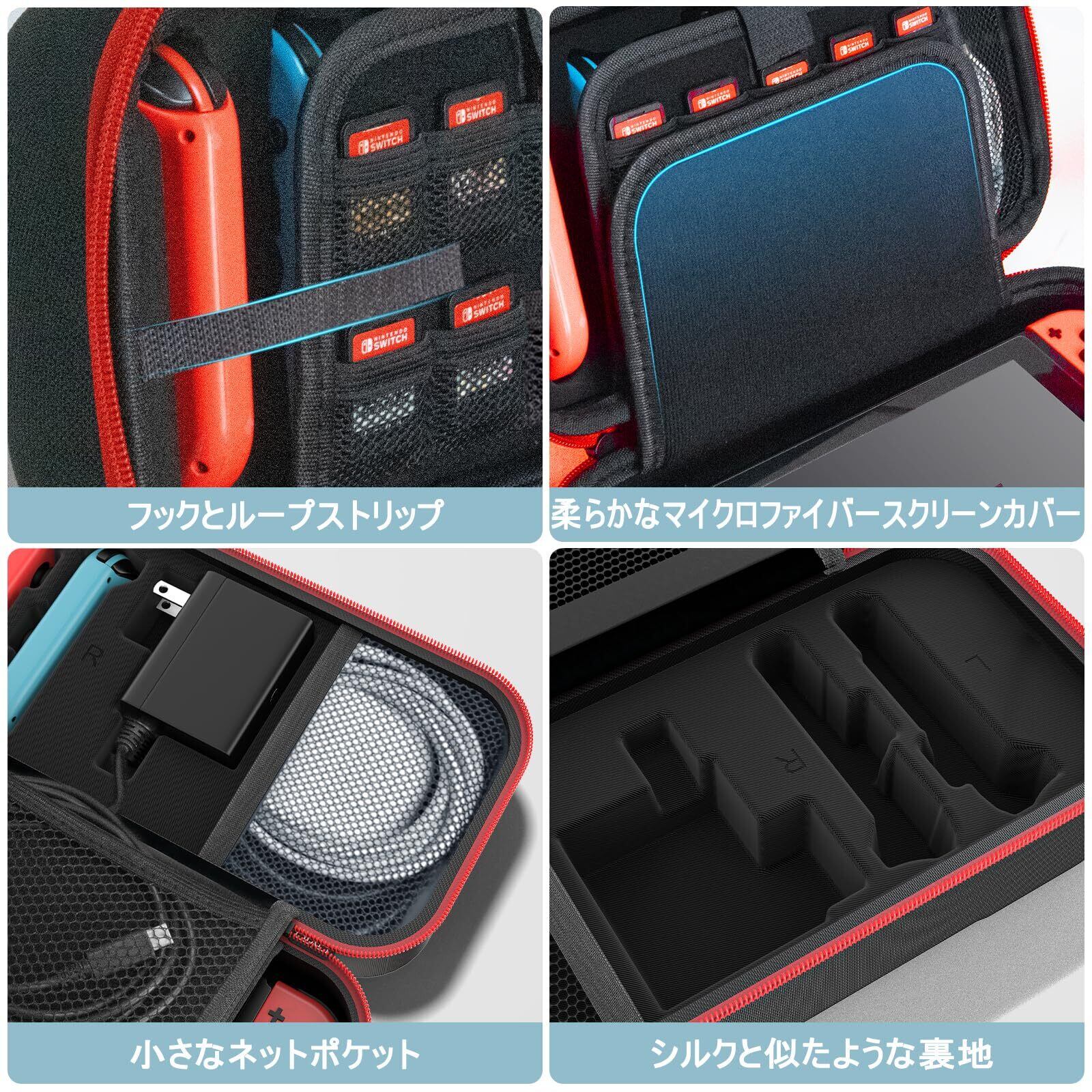 「このケースは欲しいものをすべて収納できる大容量設計です。Nintendo Switch本体に加え、ゲームカードや充電器、その他のアクセサリーも一緒に収納できるので、外出時に必要なアイテムをすっきりまとめて持ち運ぶことができます。」