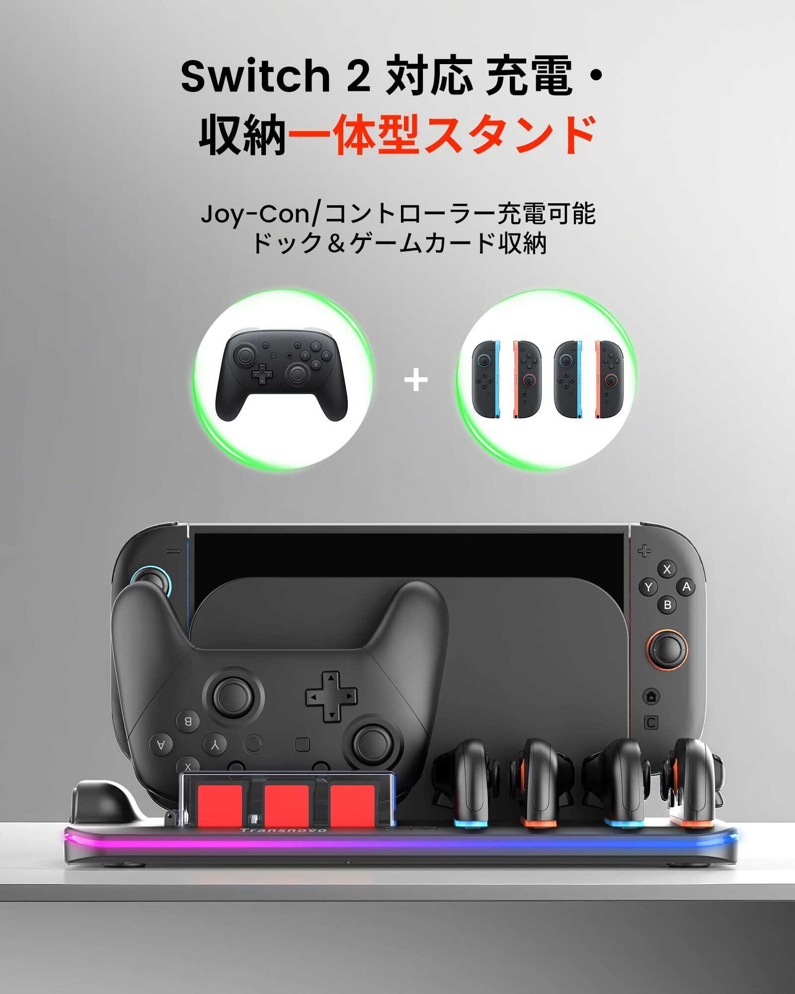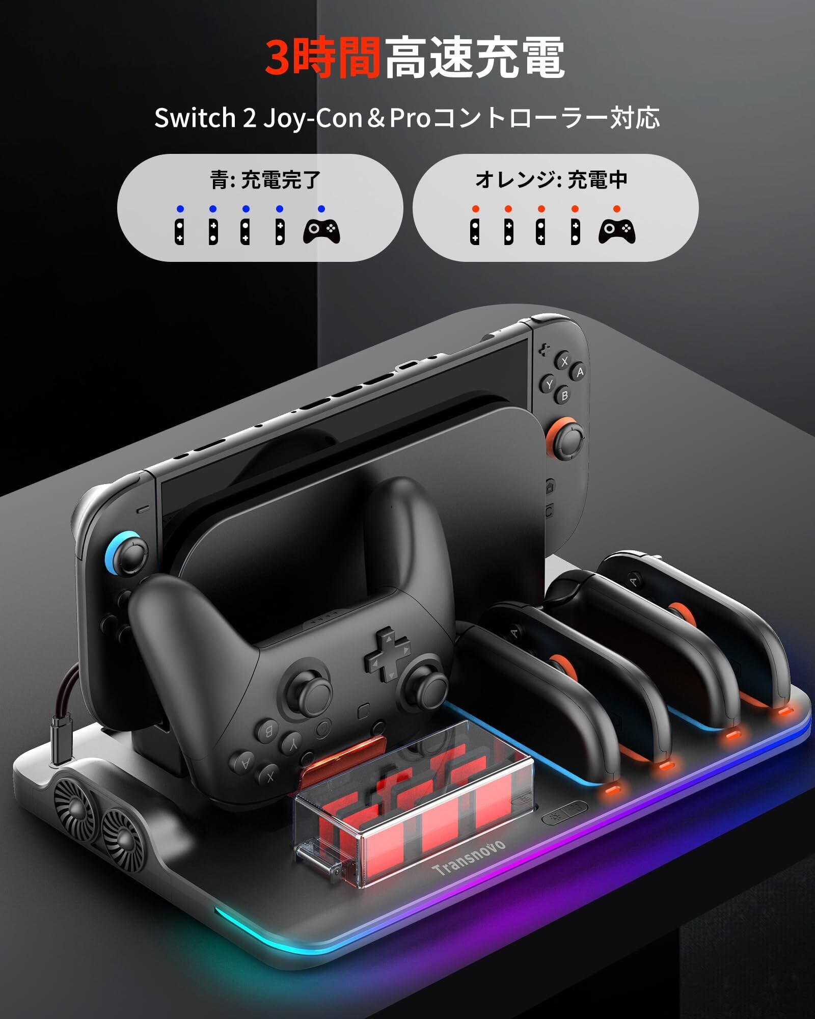 【2025革新的 6 In 1 排熱&充電&収納】TRANSNOVO Switch 2 Pro & ジョイコン対応冷却充電器 ニンテンドースイッチ2対応 3H急速充電スタンド 排熱ファン内蔵 磁着式Joy Con4台+Pro冷却风扇コントローラードック 9枚ゲームカード収納 LED充電指示ランプ&9つのRGB ライト付き 一体型 Type-Cケーブル付属 日本語取扱説明書 (黒)