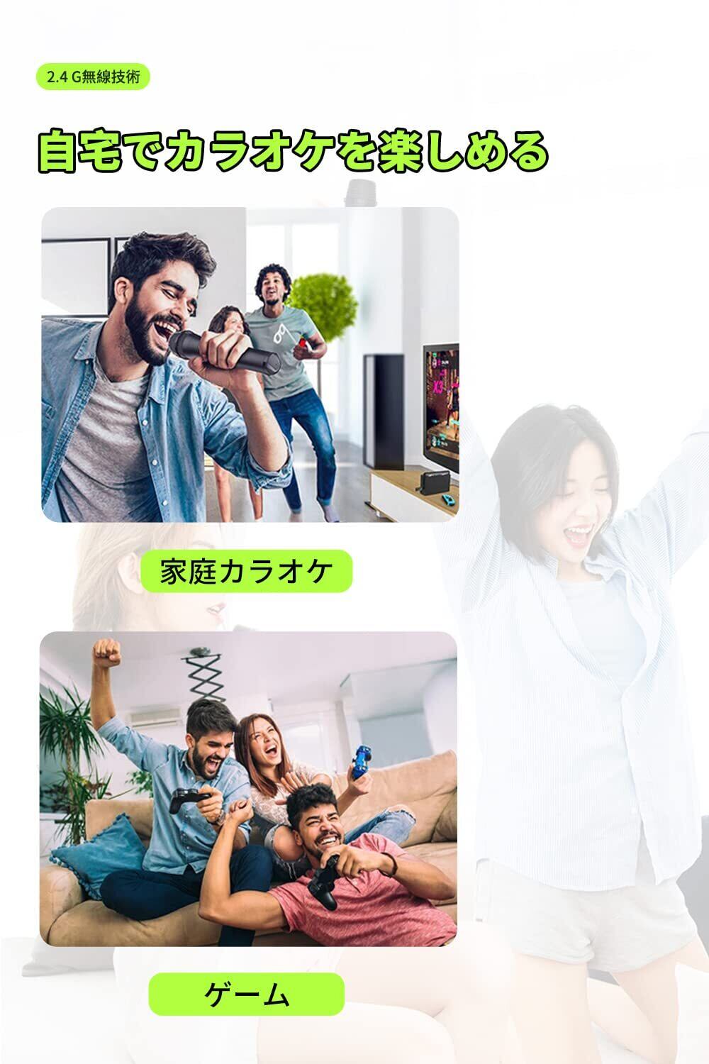 「2.4Gの無線伝送技術を活用し、遅延を最小限に抑えた快適な操作を提供します。コードレスなので、自由な動きが可能!歌うことに集中でき、最高のパフォーマンスを引き出します。」