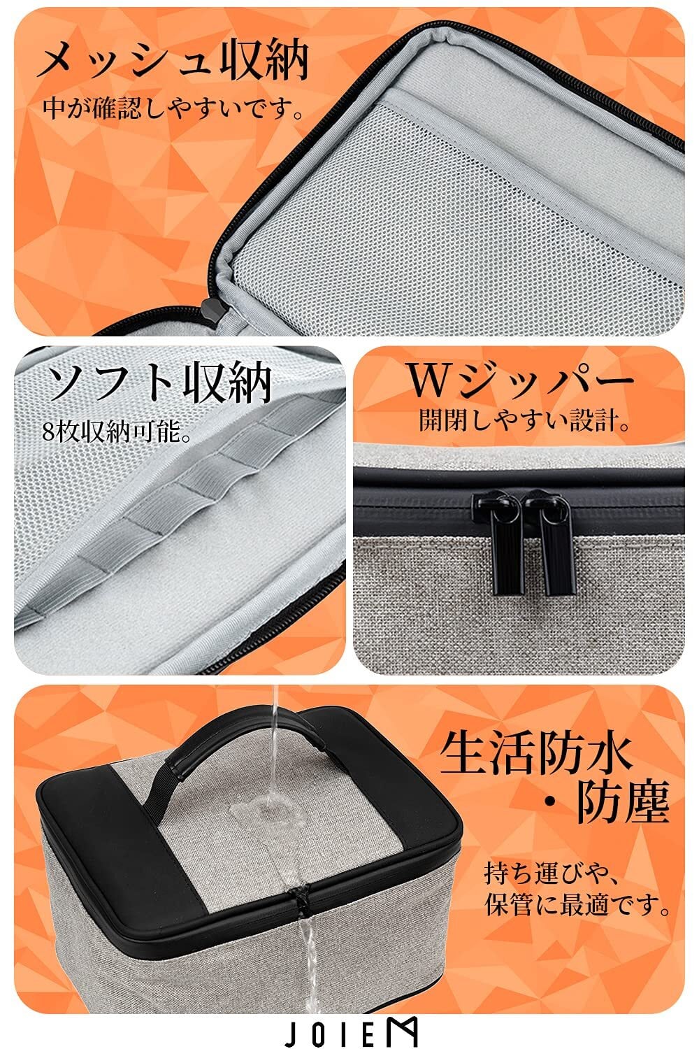 【■商品仕様】●持ち手付き・手提げタイプ●防水防塵加工●タテ25.5㎝×ヨコ17.5cm×高さ19cm(持ち手部分含む)●付属品:仕切り大小4つ●材質:ナイロン、ダブルジッパー●到着後30日間返品返金対応いたします。
