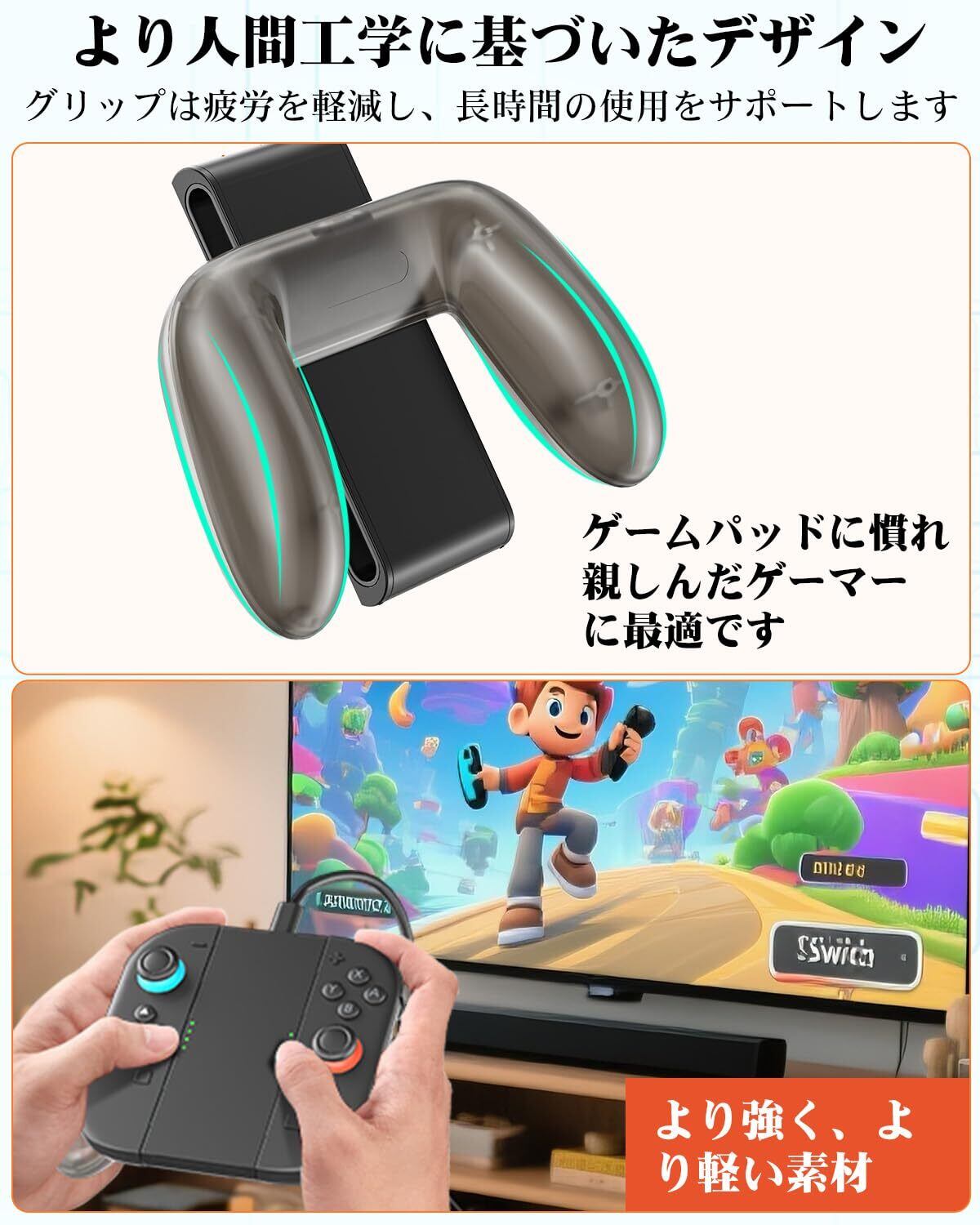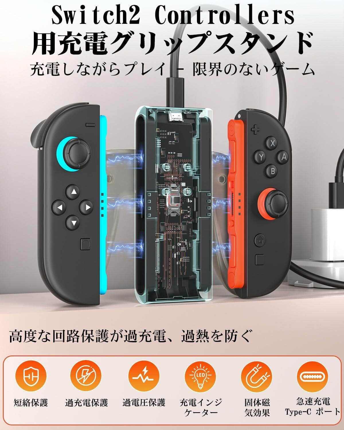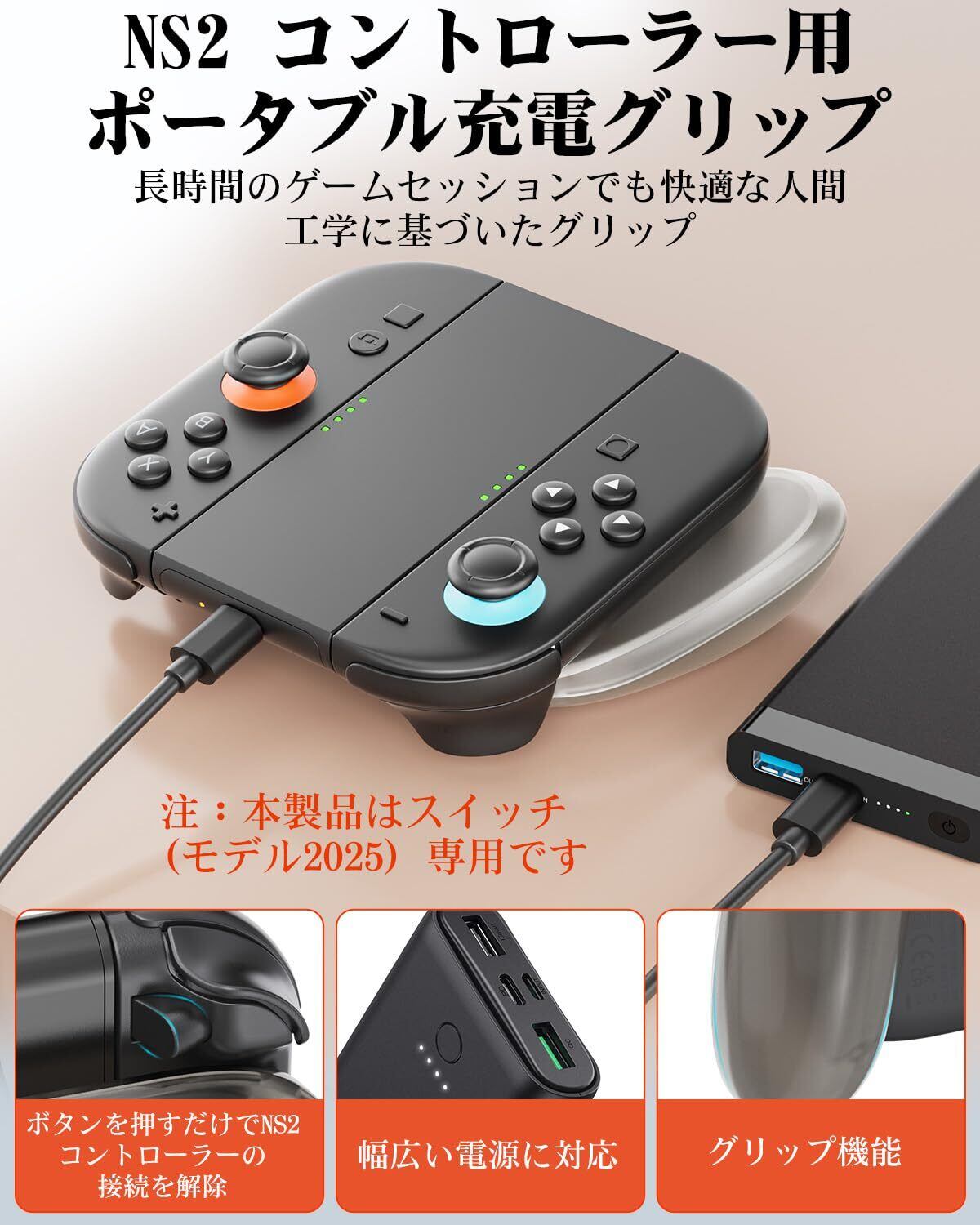 「この充電グリップはSwitch 2やジョイコンと完璧に連携し、ゲームプレイの質を向上させます。快適にプレイできるグリップと便利な充電機能で、包括的なゲーム体験をサポートします!」
