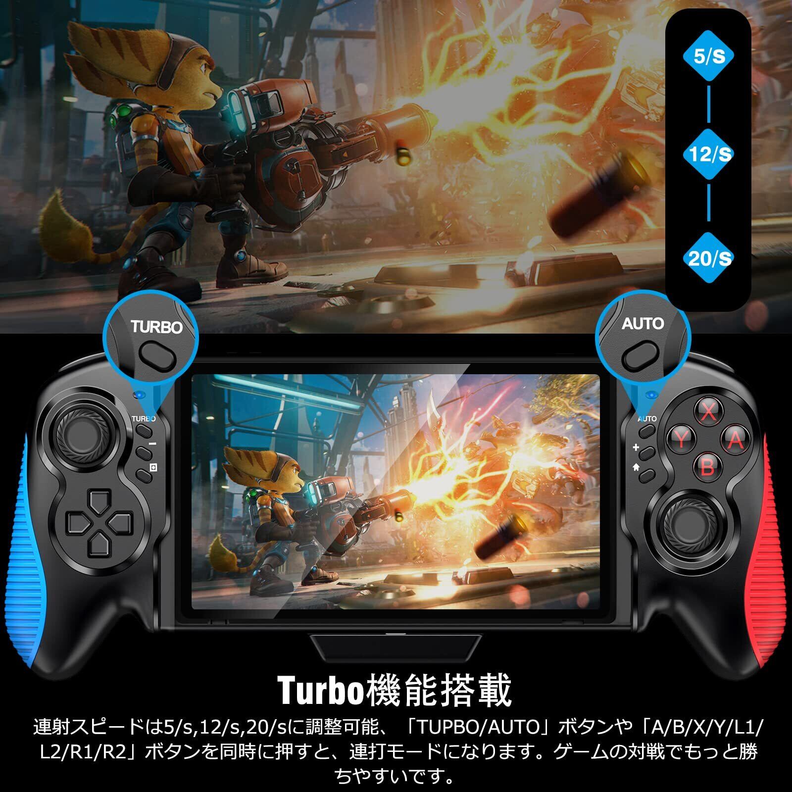 「手動及び自動で連射機能が搭載されており、連打が必要なゲームでも快適にクリア可能!連射スピードは4段階で調整できるので、あなたのプレイスタイルに合った設定が行えます。連続入力も滞りなく、勝利に近づくチャンスを逃しません!」
