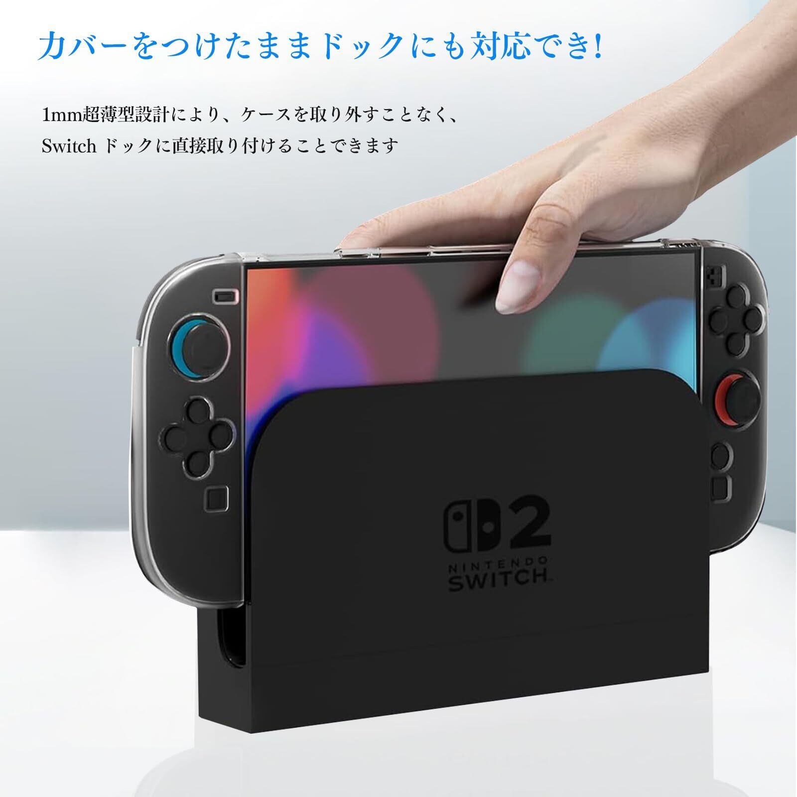 「このクリアケースは、本体全体を包み込む設計によって、傷や汚れからNintendo Switch 2を守ります。また、ドックにも対応しているため、ゲームのスタイルを問わず安心して使用できます。」