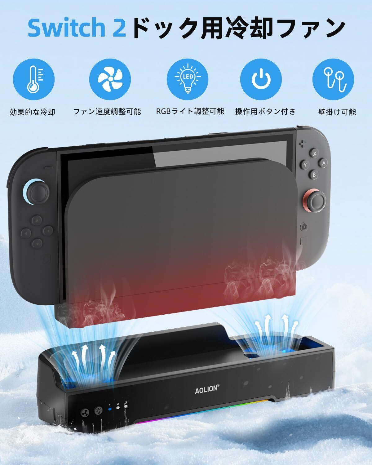 Switch 2用 冷却ファン スイッチ2ドック対応 三段階風速 調整可能 RGBライト付き 静音設計 壁掛け対応 ダブルファン 冷却スタンド USB接続型 放熱クーラー switch 2 周辺機器