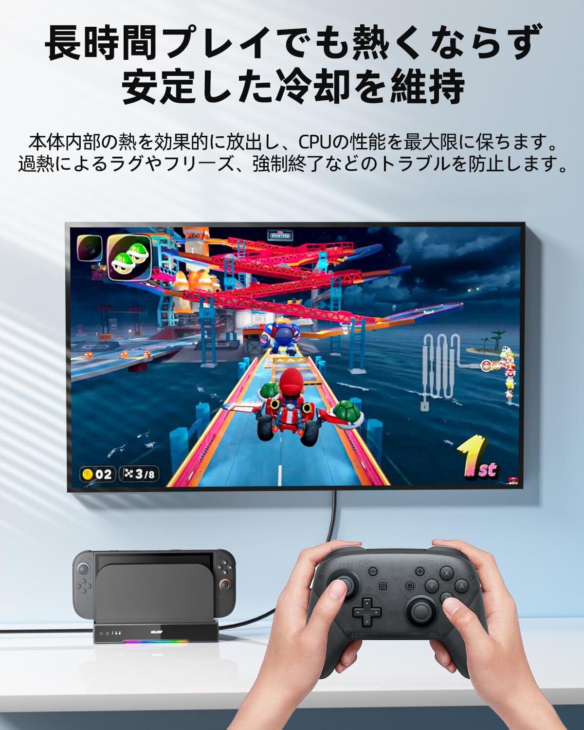 「Switch 2のパフォーマンスを最大限に引き出すため、この冷却ファンは高効率かつ強力な風量を提供します。熱暴走によるフリーズや動作異常を防ぎ、長時間のゲームプレイを快適にサポートします。安心してゲームを楽しむことができます!」