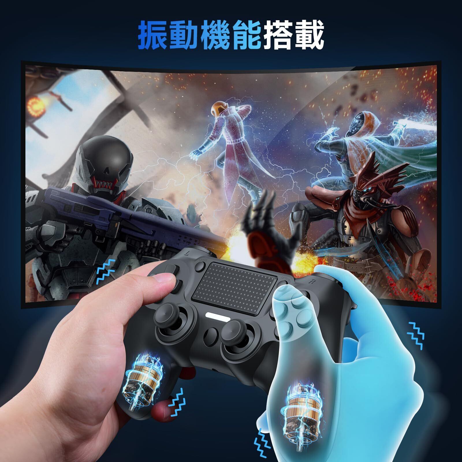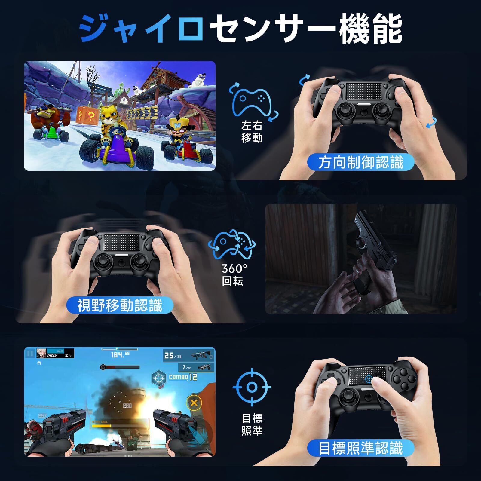 「『【2025革新モデル】P4 コントローラー』は、ゲームプレイを革新するための多彩な機能を搭載しています。無線Bluetooth接続により、遅延なくスムーズな動作を実現。1000mAhの大容量バッテリーで、長時間のプレイでも安心です!二重振動やジャイロセンサー機能が、ゲーム内のアクションをリアルに体感させます。」