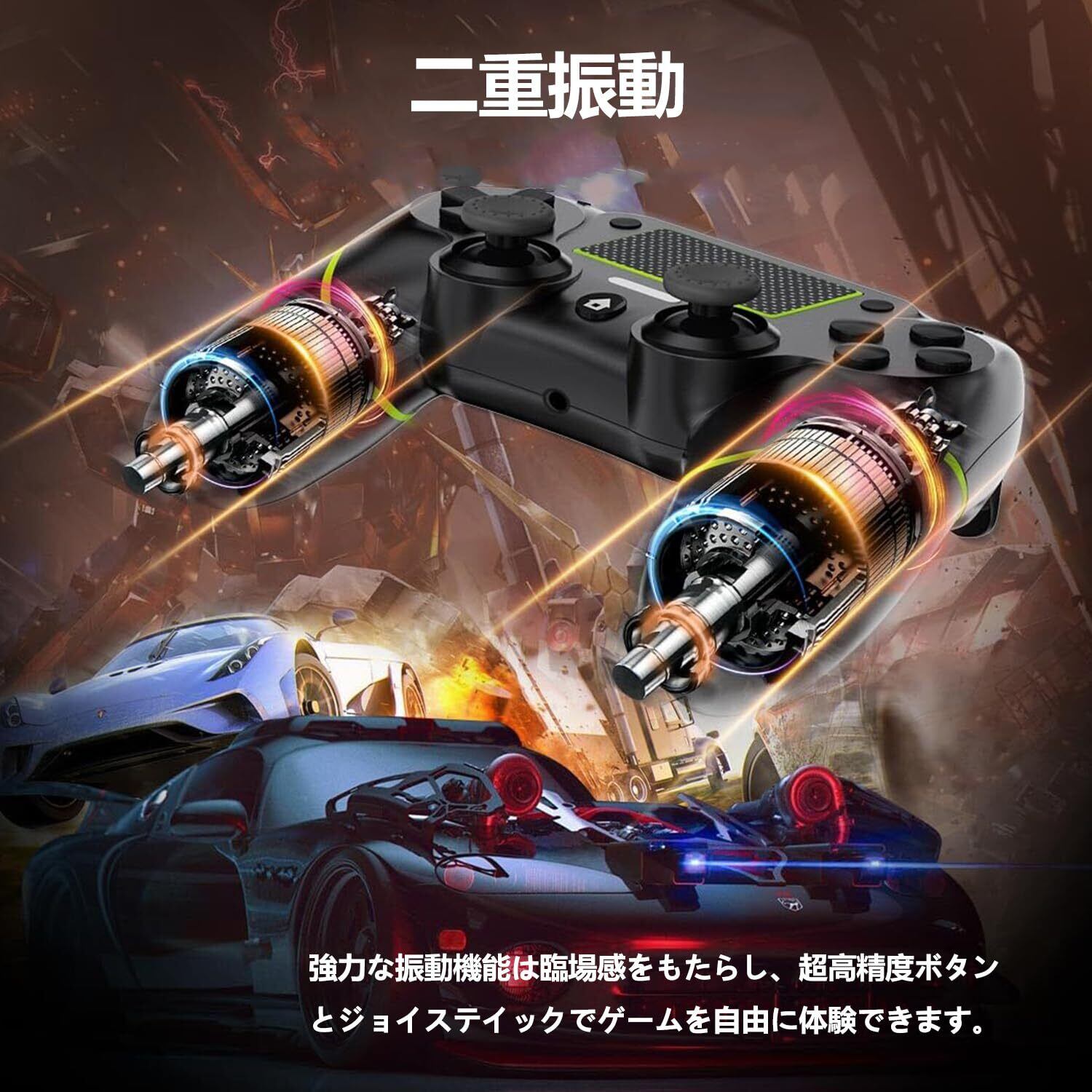 「二重振動機能により、プレイ中のアクションをリアルに体感できます。ゲームの中での興奮を感じつつ、没入感を引き立てる体験をお楽しみください。重力感応センサーも搭載しており、動きに応じた操作が可能です!」