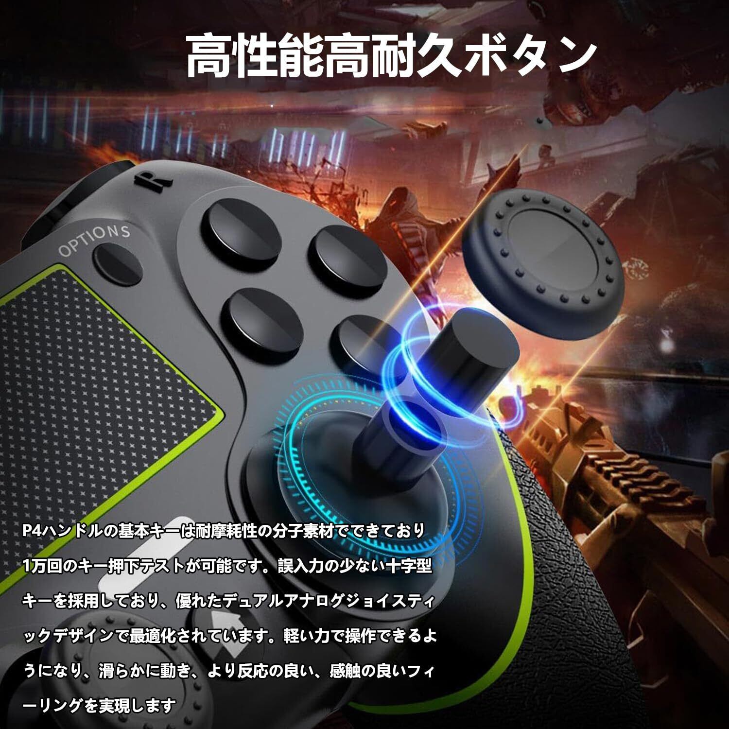 【高性能高耐久ボタン】PS-4ハンドルの基本キーは耐摩耗性の分子素材でできており、1万回のキー押下テストが可能です。誤入力の少ない十字型キーを採用しており、優れたデュアルアナログジョイスティックデザインで最適化されています。軽い力で操作できるようになり、滑らかに動き、より反応の良い、感触の良いフィーリングを実現します。ボタンを押したら強力なバネによって戻ってくる、精密なボタン配置で、良い操作性があります。共有ボタンを使用すると、エキサイティングなゲームクリップをいつでもソーシャルネットワークで共有できます。超高精度ボタンとジョイスティックでゲームを自由に体験できます。