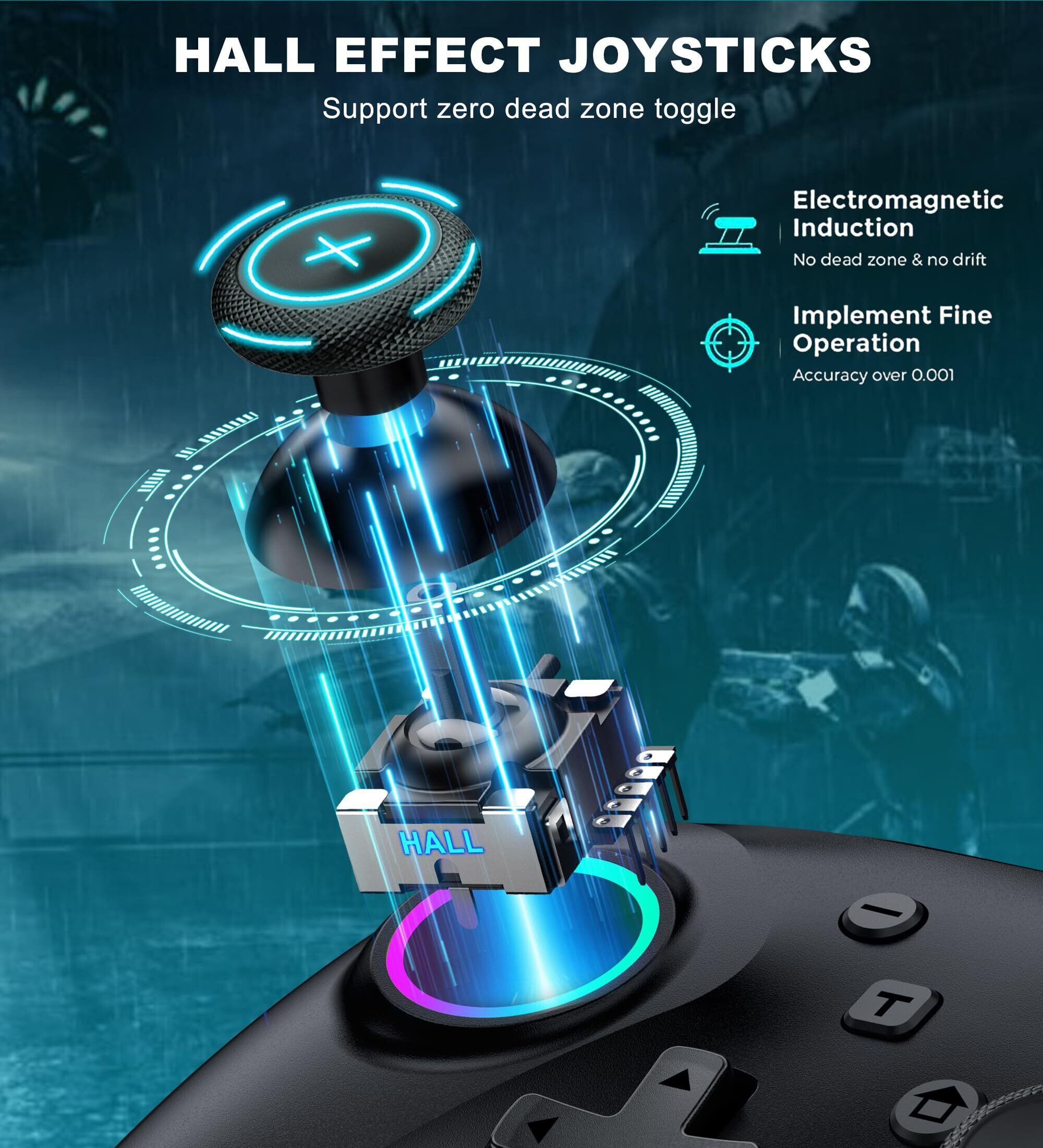 【6種類発光モードコントローラー&4段階の明るさ調整可能】PC コントローラーには8色のRGBライトと6つの発光モードが搭載されており、異なる色の組み合わせによって新たな照明色が生まれます。流れる色、呼吸する色、固定色、固定青、固定赤、左赤と右青の6つのモードを自由に選択することができます。このスイッチ プロコンには、調整可能な 4 段階の明るさ (25%-50%-75%-100%) があり、M + 左/右ボタンで明るさを増減できます。これにより、斬新で多彩なゲーム体験がもたらされます。
