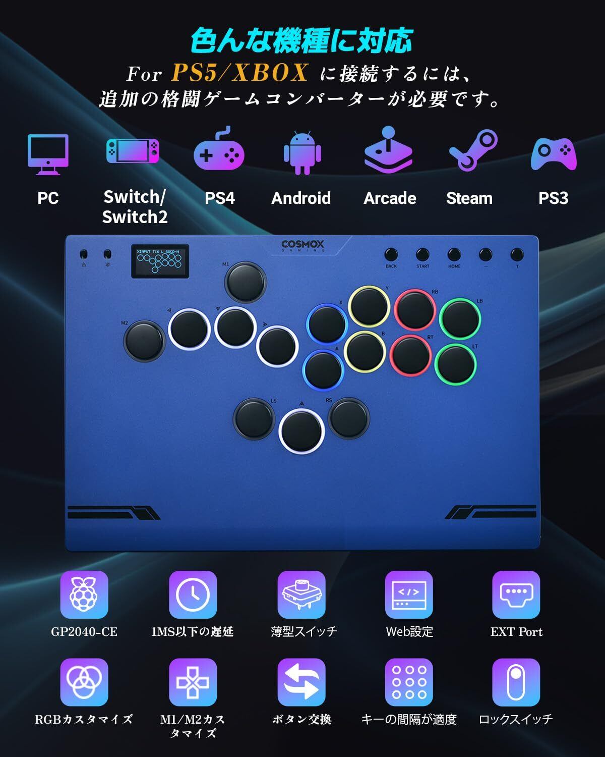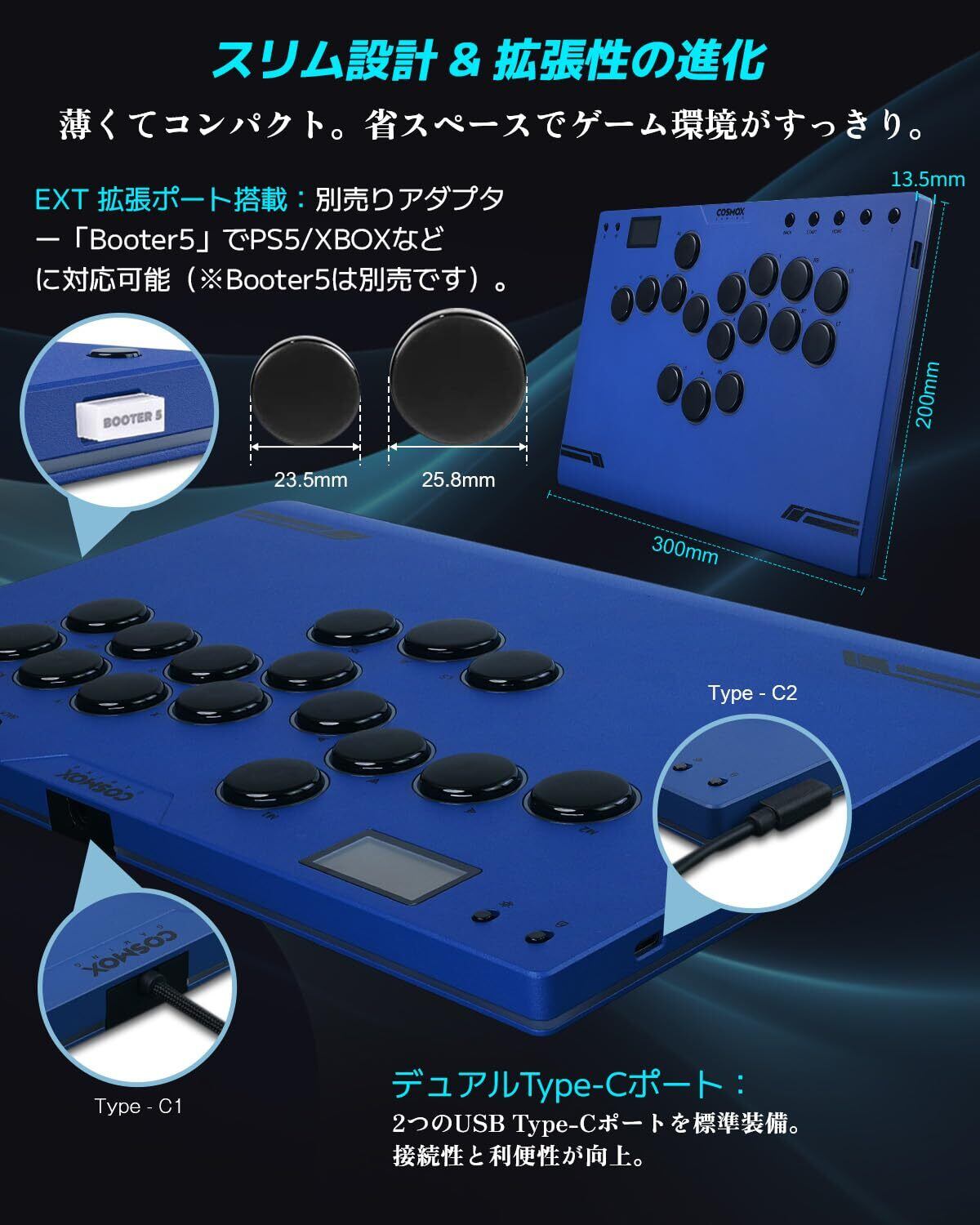 「同梱内容」本体(16ボタン)、3m Type-Cケーブル、Shadow huntingスイッチ(予備2個)、スイッチ引き抜きツール、日本語取扱説明書。※ご注意PS4/PS5/Xboxシリーズへの接続には別売りのコンバーター(Booter5等)が別途必要です。詳細はメーカー公式サイト(haute42-cosmox)でご確認ください。