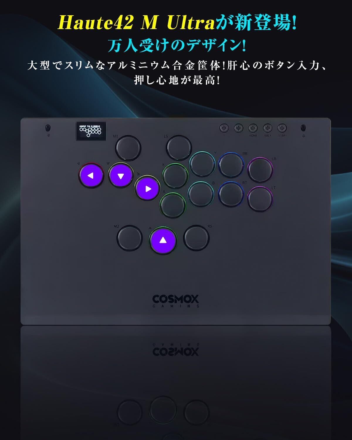 「『Haute42 アケコン レバーレス コントローラー M Ultra』は、最上位アルミ合金筐体で作られており、確かな耐久性と高級感を兼ね備えています。プレイヤーの手にしっかりとフィットし、操作の安定感を実現する贅沢なデザインが、ゲームプレイを一層引き立てます!」