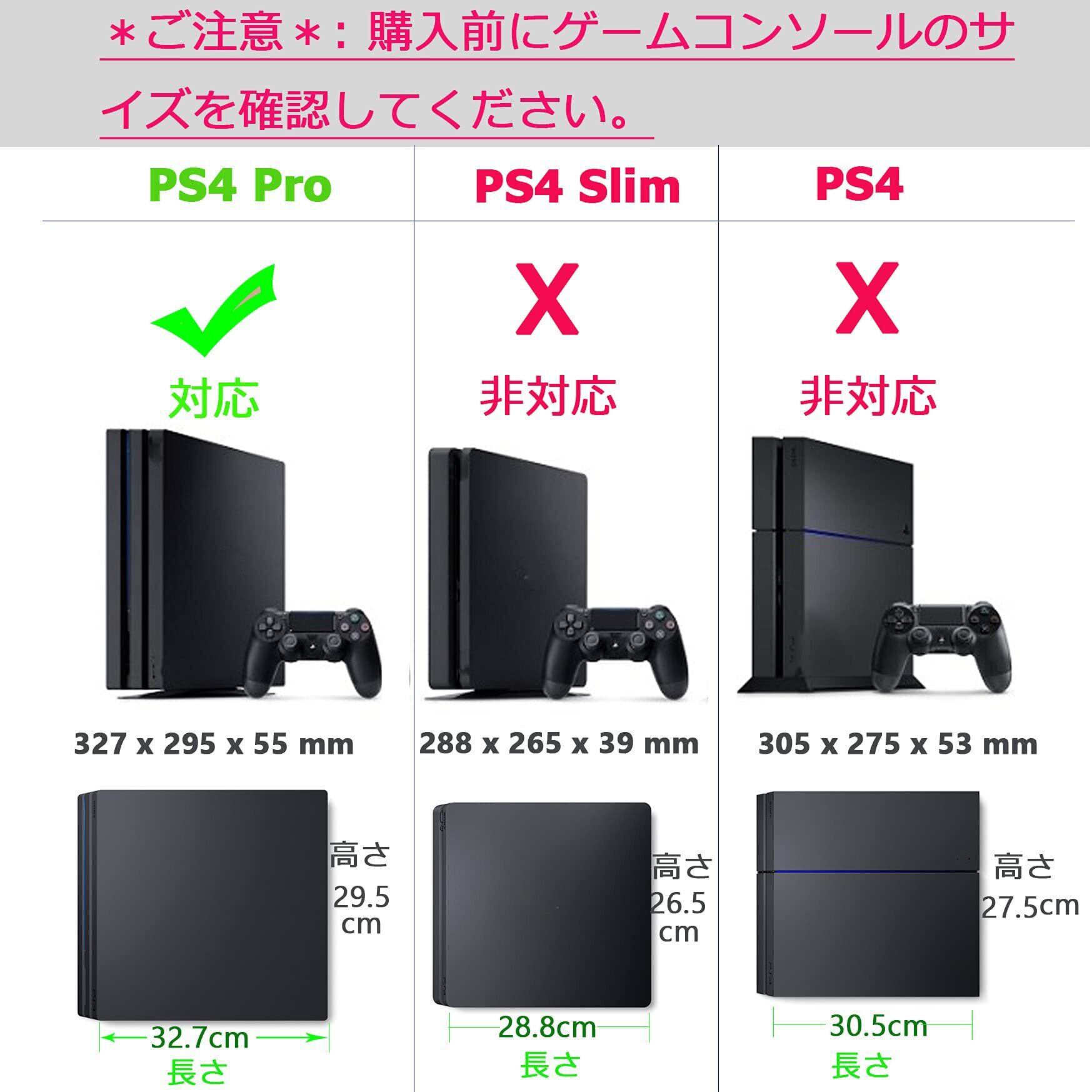 PS4 Pro (PS4 Proサイズ: 327x295x55mm)専用の縦置きスタンドです。*ご注意*: 購入前にゲームコンソールのサイズを確認してください。**PS4 2013/PS4 Slimに対応しない。