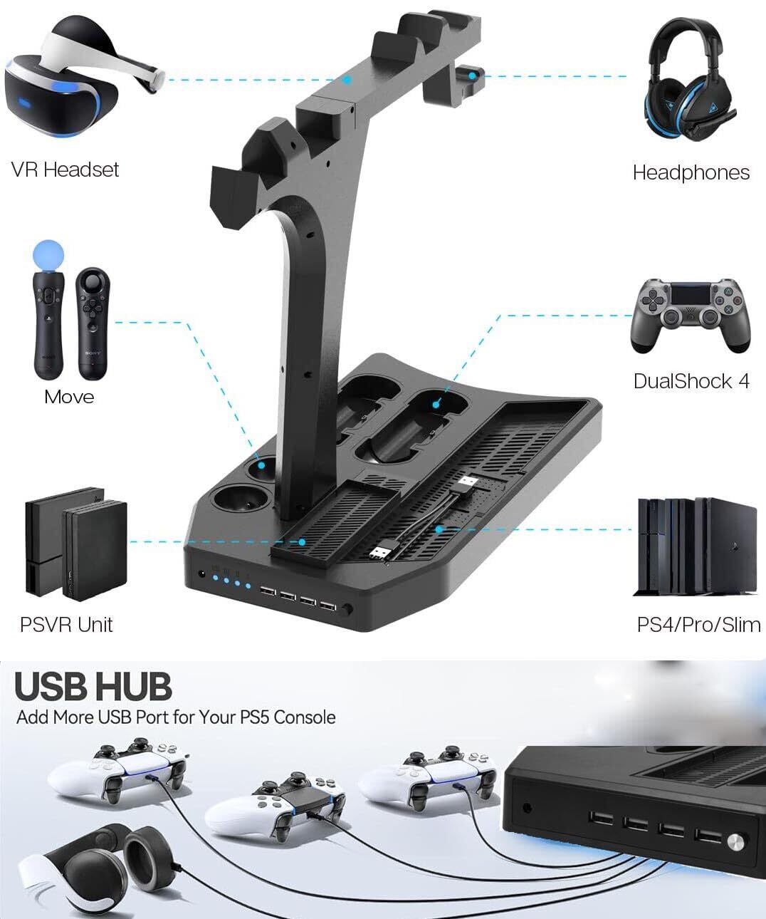 FiSound PSVR・PlayStation 4・PS4 Pro ・PS4 Slim多機能縦置きスタンドPlayStation4ワイヤレスコントローラー2台&PlayStation moveモーションコントローラー2台同時充電なスタンド VRゴーグル+ヘッドセット+DUALSHOCK4+Move Motion Controlle収納 ゲーム用ホルダー PlayStation4・プロ・スリムから給電4個USBボット付き、PS4本体冷却ファン付き日本語取扱説明書付属最新型