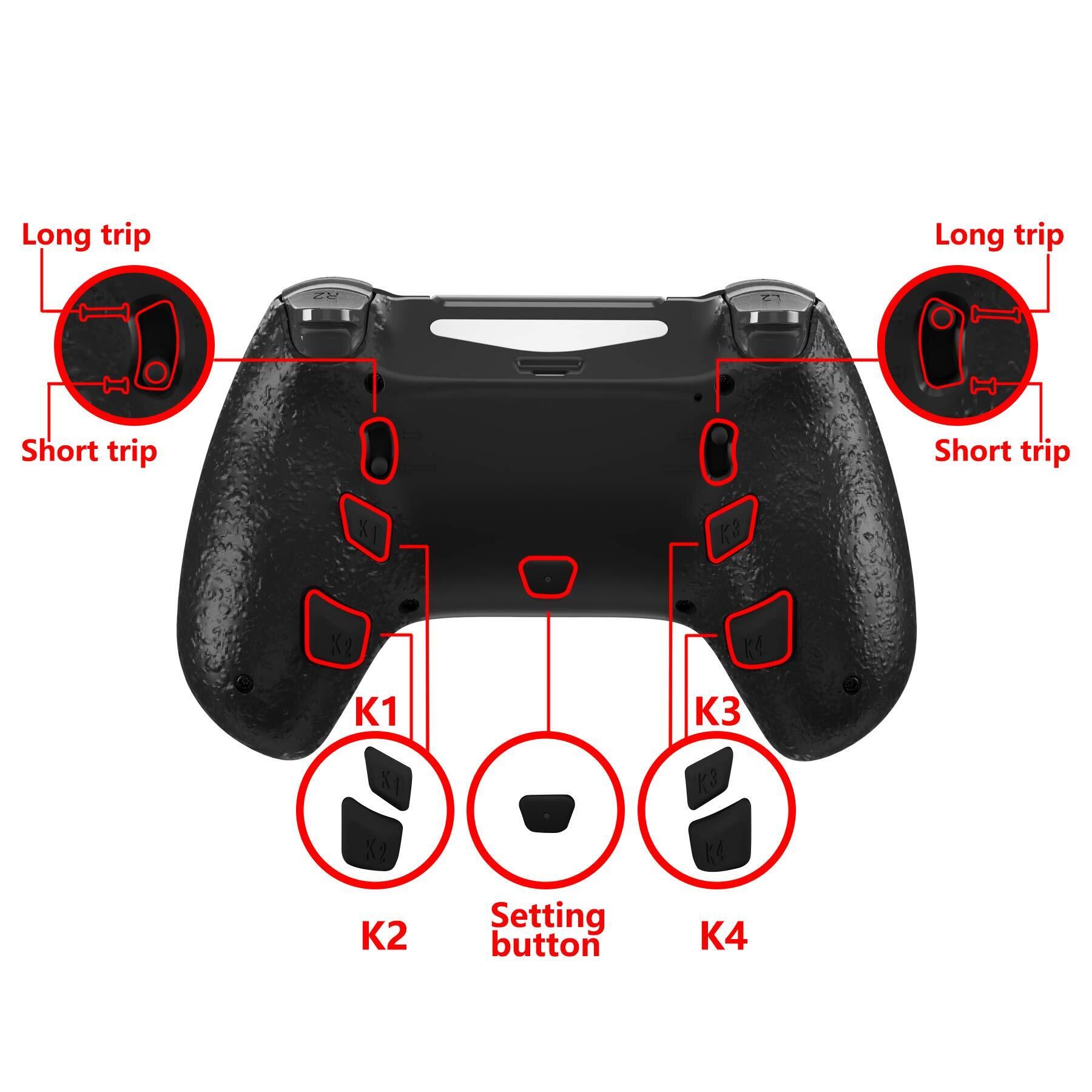 リマップ機能:人間工学に基づいたプログラム可能な背面ボタンのアタッチメント4つが追加されました。最大15個のボタン(X、O、三角形、正方形、上、下、左、右、L1、L2、R1、R2、L3、R3、およびタッチパッドボタン)をバックボタンに割り当てることができます。